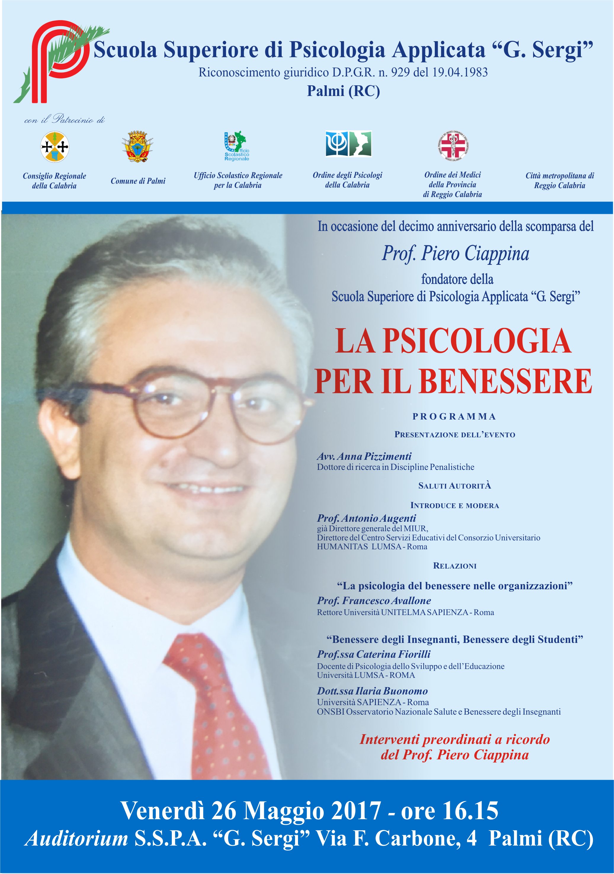 La Scuola Superiore di Psicologia Applicata “G. Sergi” organizza il Convegno di studi sul tema “La Psicologia per il Benessere” che si svolgerà venerdì 26 maggio, alle ore 16.15 presso l’Auditorium della Scuola. L’evento è stato organizzato in occasione del decimo anniversario della scomparsa del Prof. Piero Ciappina, fondatore della Scuola “G. Sergi”, ed è patrocinato dal Consiglio Regionale della Calabria, dalla Città Metropolitana di Reggio Calabria, dal Comune di Palmi, dall’USR Calabria, dall’Ordine degli Psicologi della Calabria e dall’Ordine dei Medici della Provincia di Reggio Calabria. Interverranno il prof. Francesco Avallone – Rettore Università UNITELMA SAPIENZA -Roma , la prof.ssa Caterina Fiorilli – Docente di Psicologia dello Sviluppo e dell’Educazione Università LUMSA –ROMA. e la Dott.ssa Ilaria Buonomo – Università SAPIENZA -Roma- ONSBI Osservatorio Nazionale Salute e Benessere degli Insegnanti. Moderatore sarà il prof. Antonio Augenti, già Direttore generale del MIUR, Direttore del Centro Servizi Educativi del Consorzio Universitario HUMANITAS – LUMSA –Roma, mentre l’avv. Anna Pizzimenti, Dottore di ricerca in Discipline Penalistiche, presenterà l’evento. Al termine, gli amici ricorderanno la figura del prof. Piero Ciappina che, con il suo impegno ed i suoi studi e ricerche in ambito psicologico ed educativo, ha contribuito alla formazione di molti giovani ed alla crescita culturale del territorio calabrese e non solo.