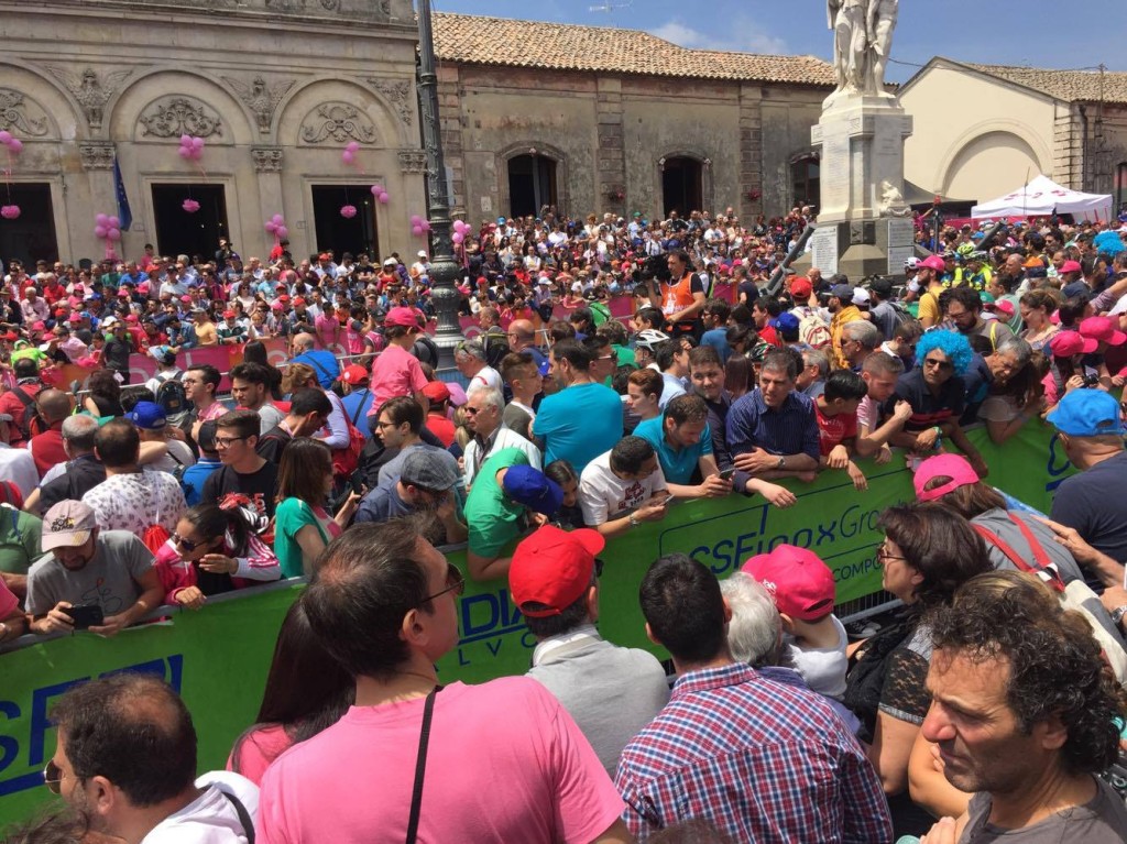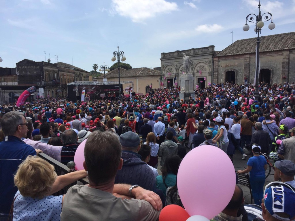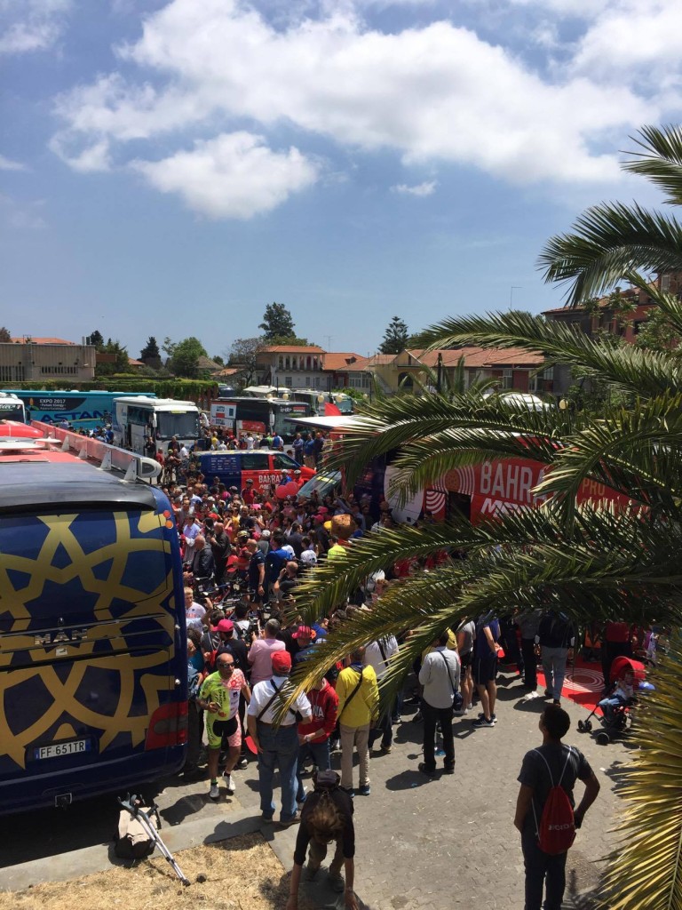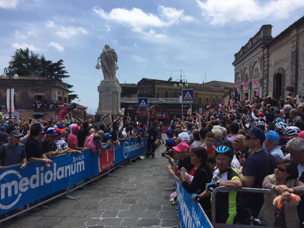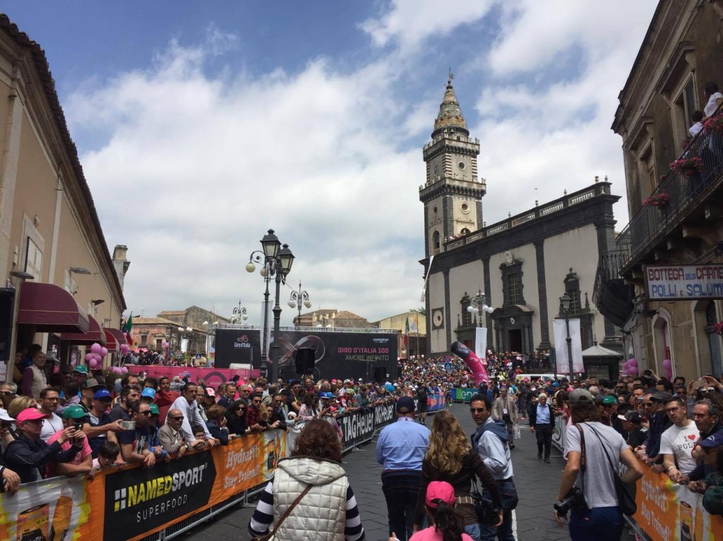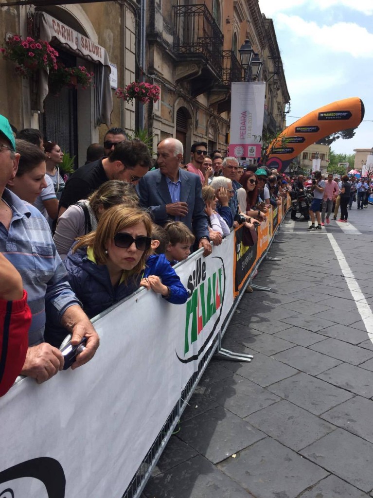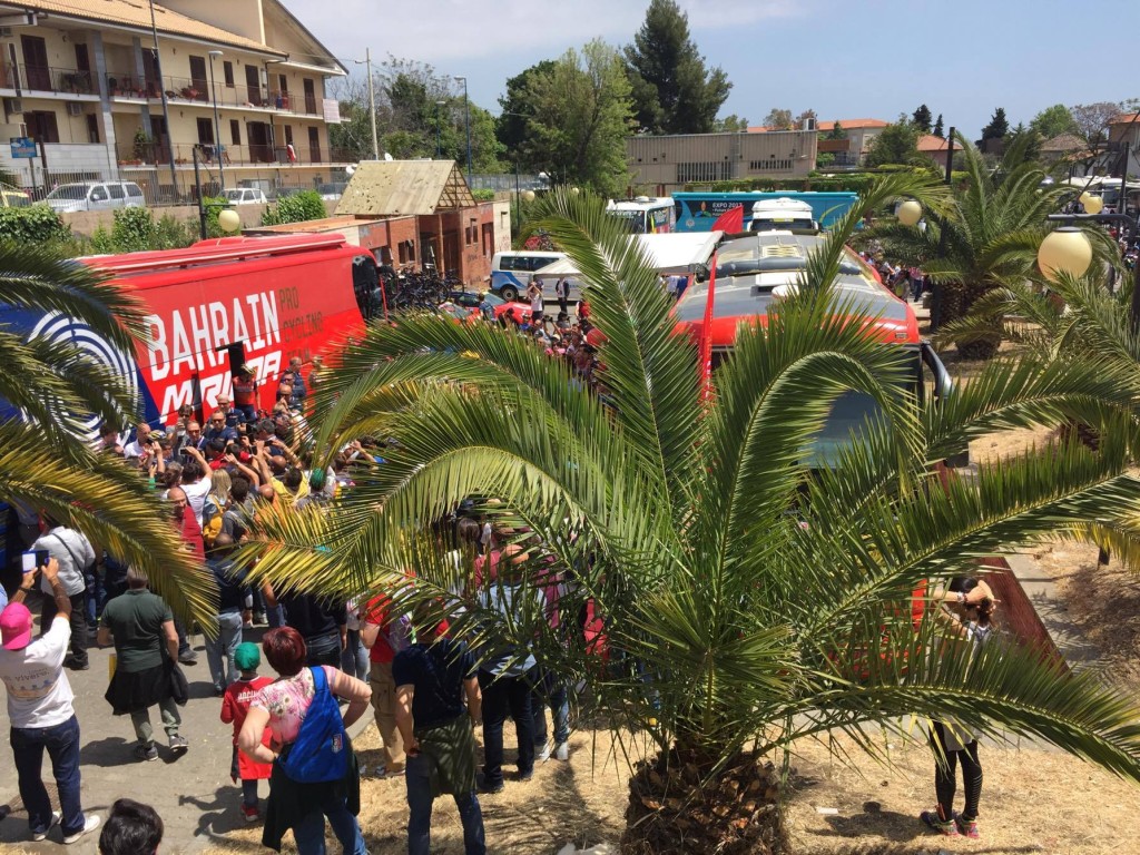 Sta partendo proprio in questi minuti la quinta tappa del giro d’italia che oggi arriverà a Messina. Grande festa alle falde dell’Etna nel centro abitato di Pedara per il gruppo di corridori che si è avvicinato al foglio firma letteralmente tra due ali di folla, diverse migliaia di persone hanno riempito il centro storico della città etnea, tributando il loro omaggio ai corridori e a tutto il gruppo ma soprattuto allo squalo dello Stretto, Vincenzo Nibali, autentico beniamino di casa, tanti gli striscioni per lui ma soprattutto tantissimi tifosi che hanno assediato il pullman del team Bahrain Merida sin dalle prime ore del mattino.