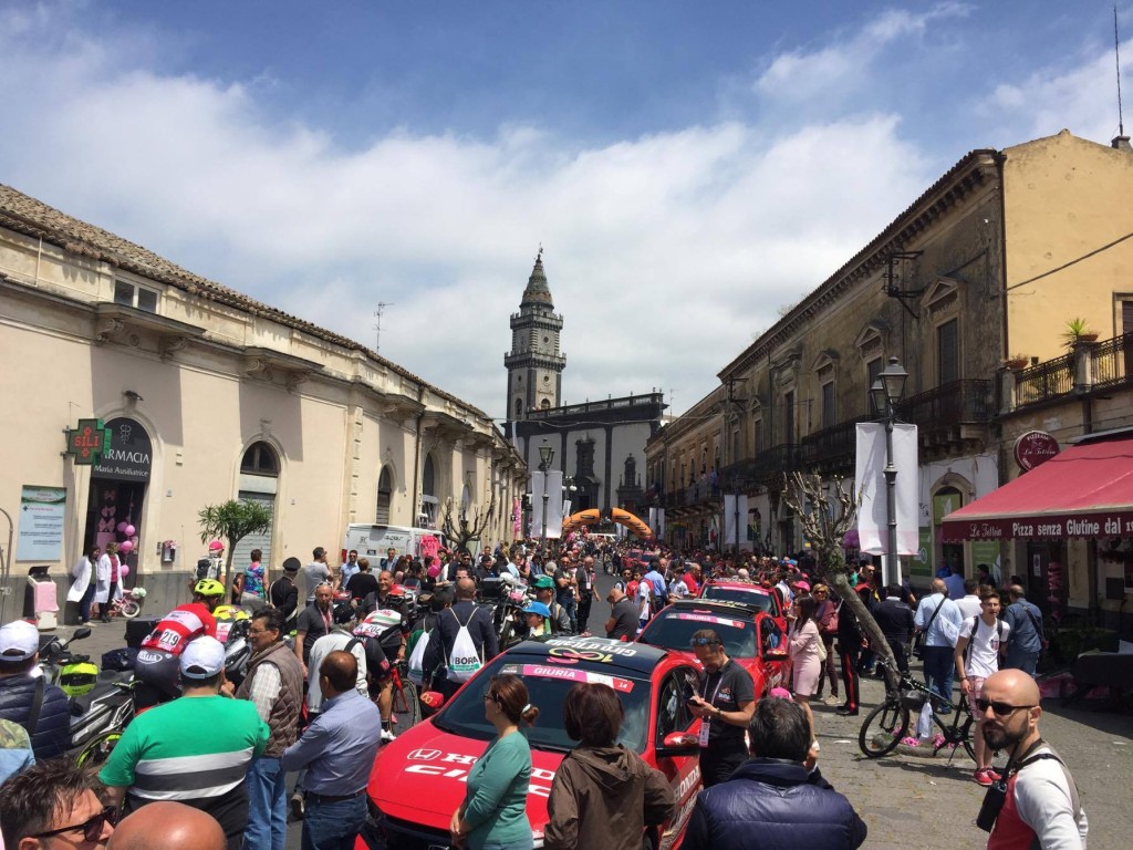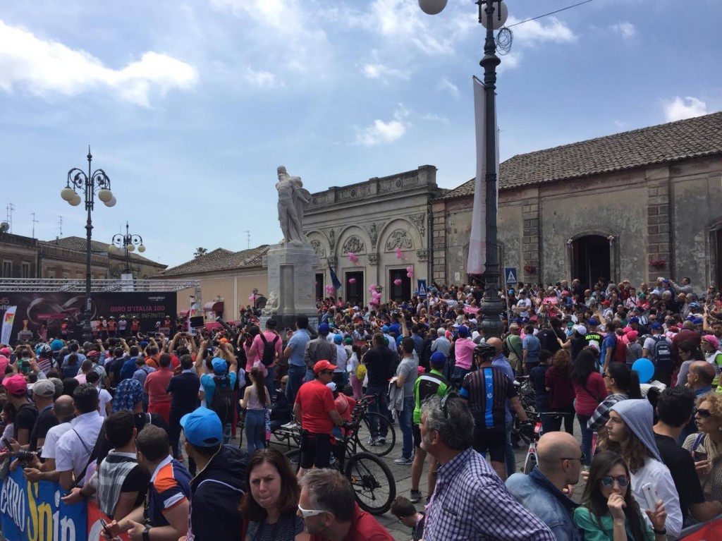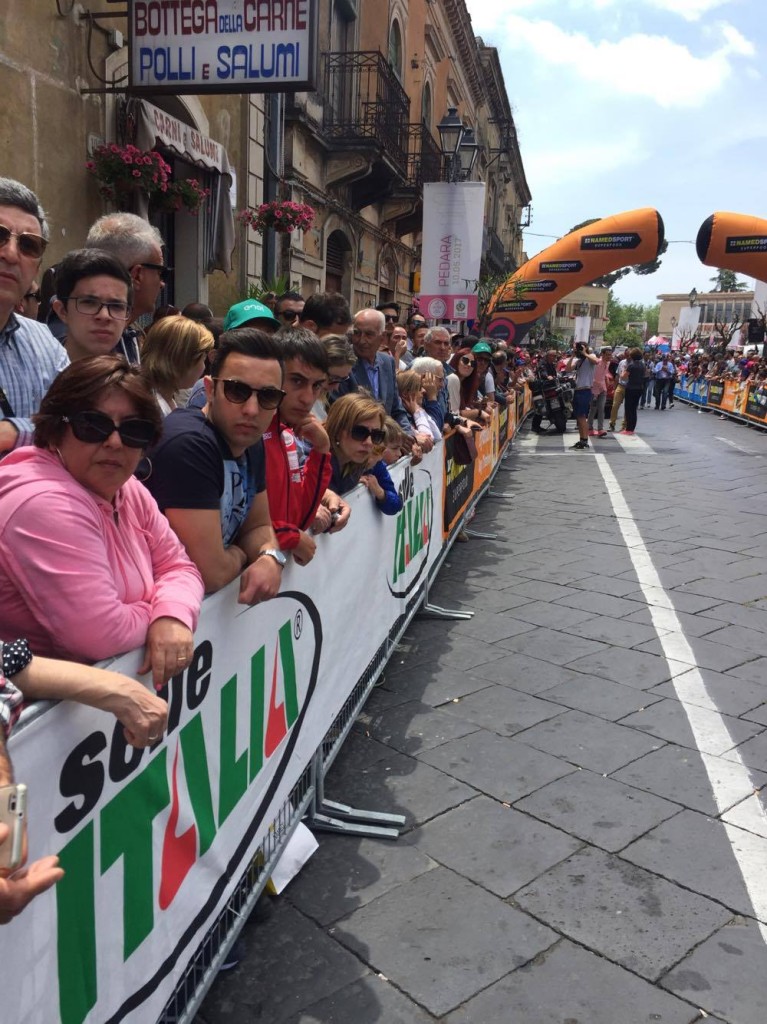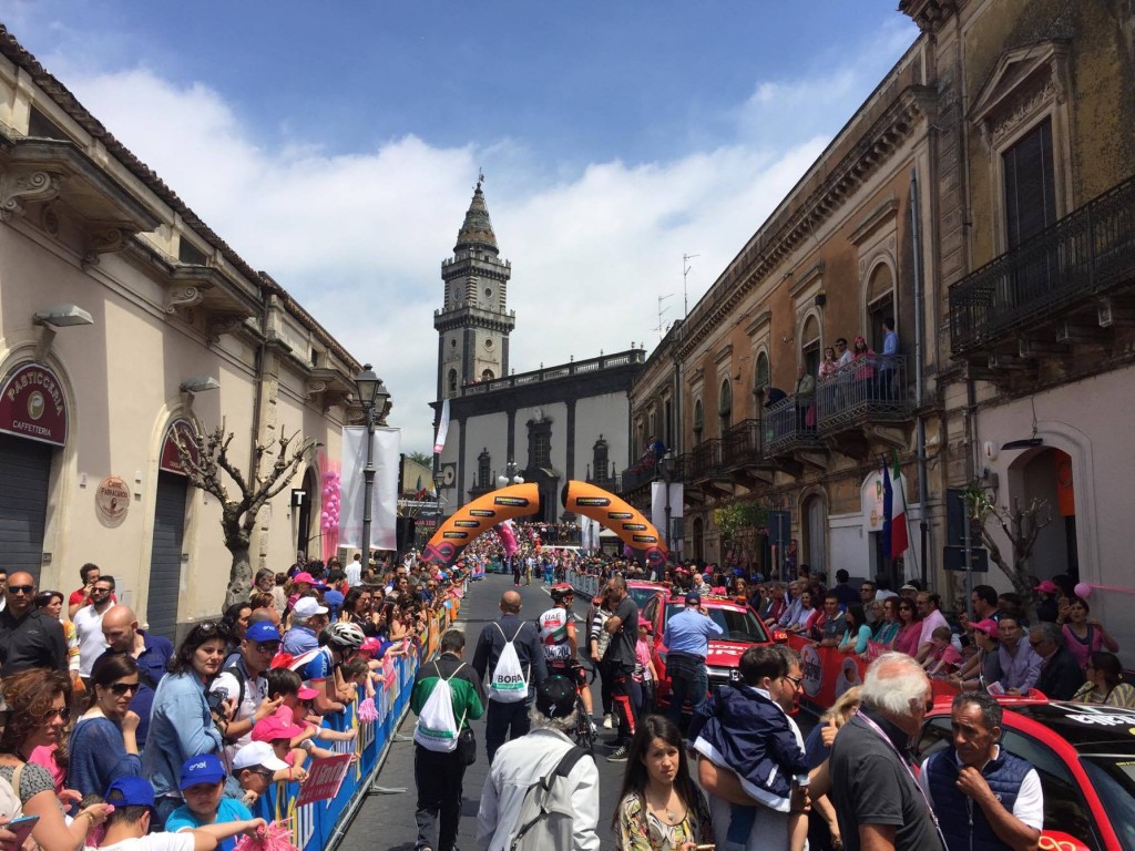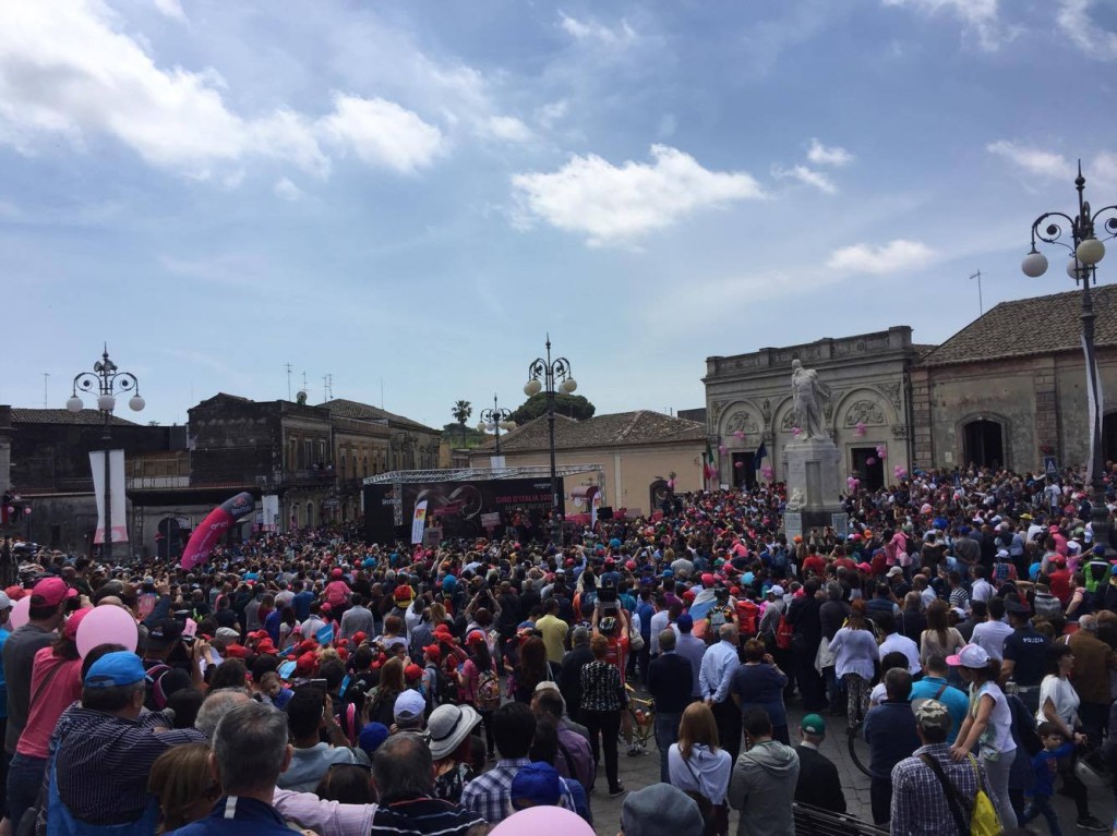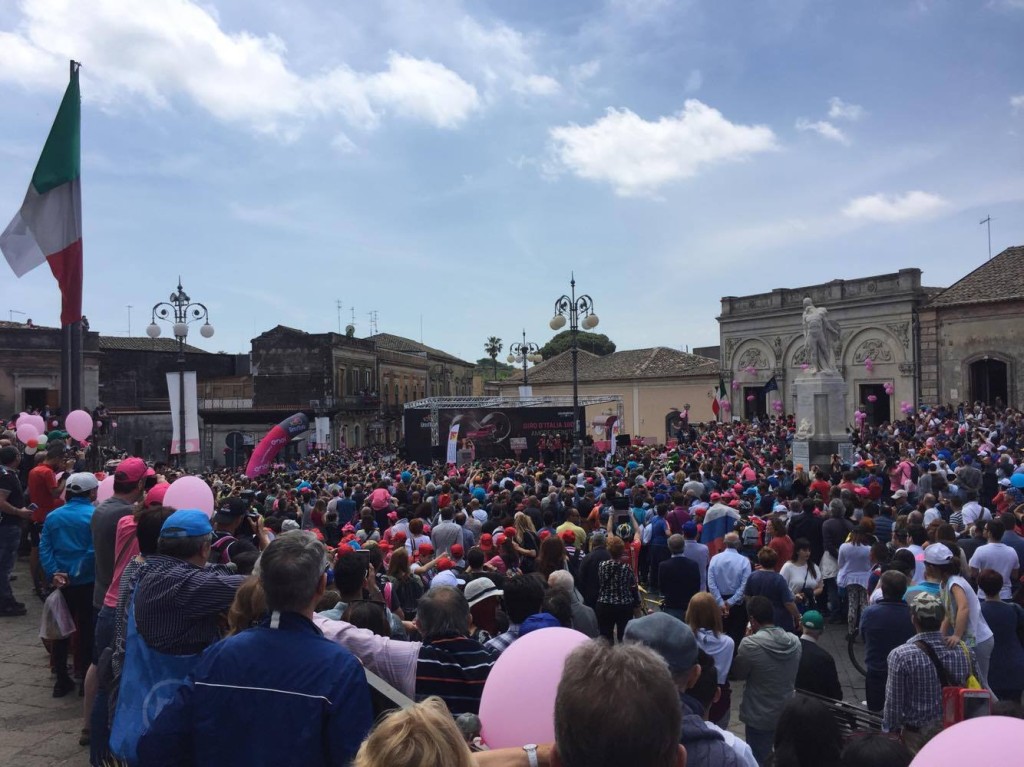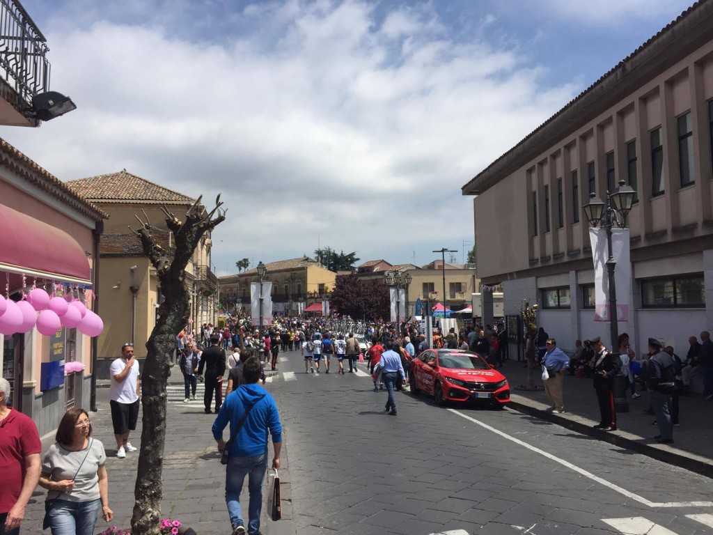 Sta partendo proprio in questi minuti la quinta tappa del giro d’italia che oggi arriverà a Messina. Grande festa alle falde dell’Etna nel centro abitato di Pedara per il gruppo di corridori che si è avvicinato al foglio firma letteralmente tra due ali di folla, diverse migliaia di persone hanno riempito il centro storico della città etnea, tributando il loro omaggio ai corridori e a tutto il gruppo ma soprattuto allo squalo dello Stretto, Vincenzo Nibali, autentico beniamino di casa, tanti gli striscioni per lui ma soprattutto tantissimi tifosi che hanno assediato il pullman del team Bahrain Merida sin dalle prime ore del mattino.