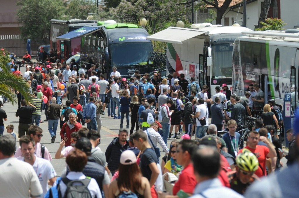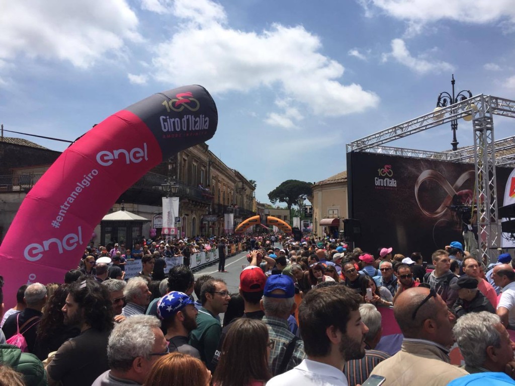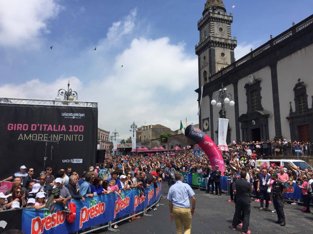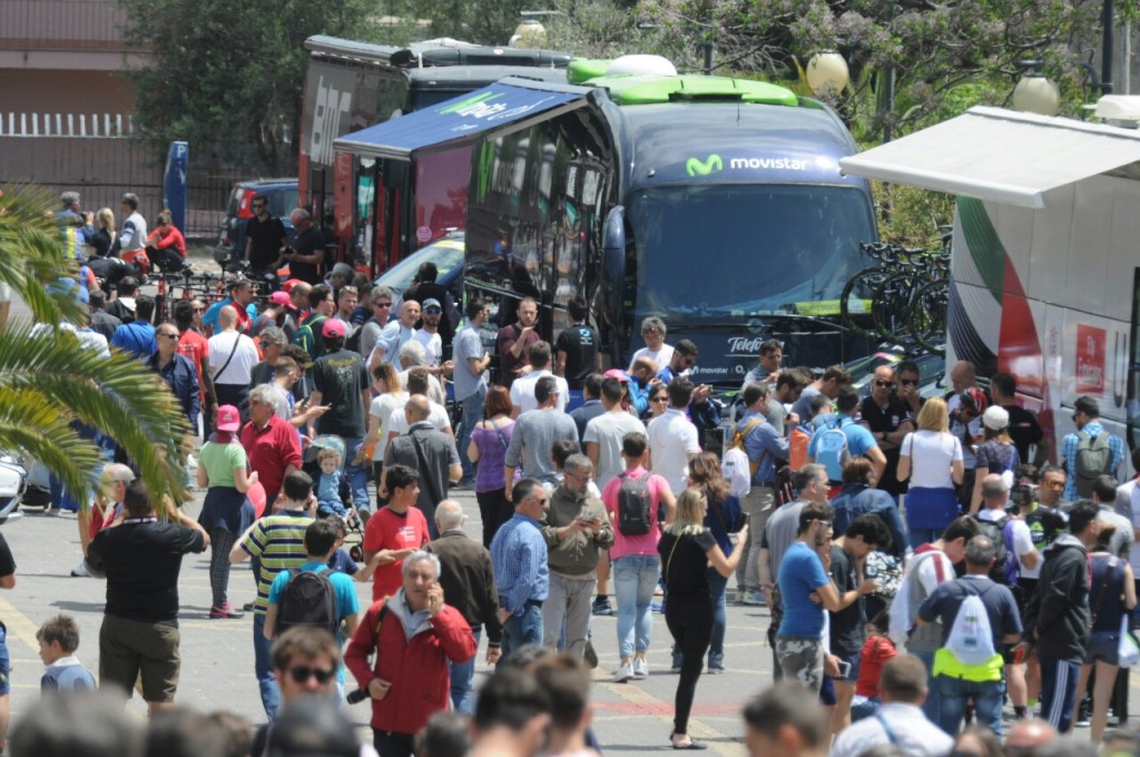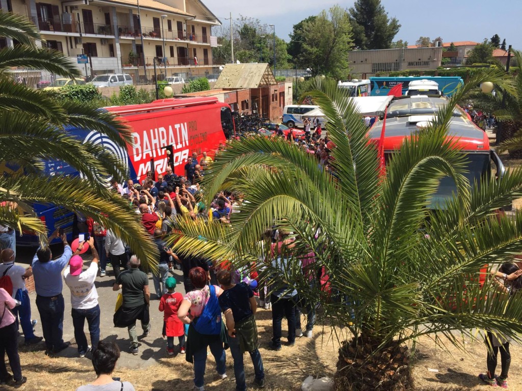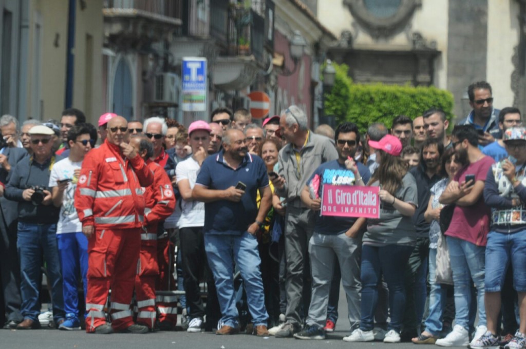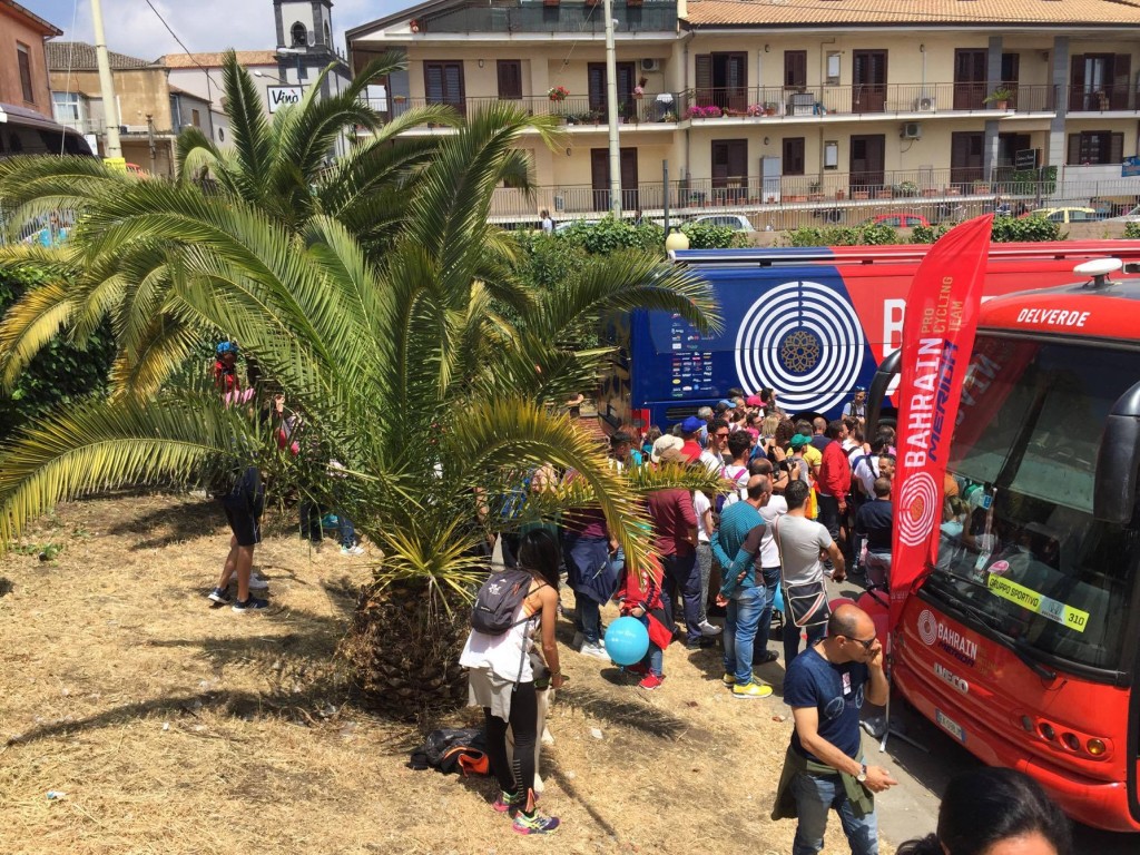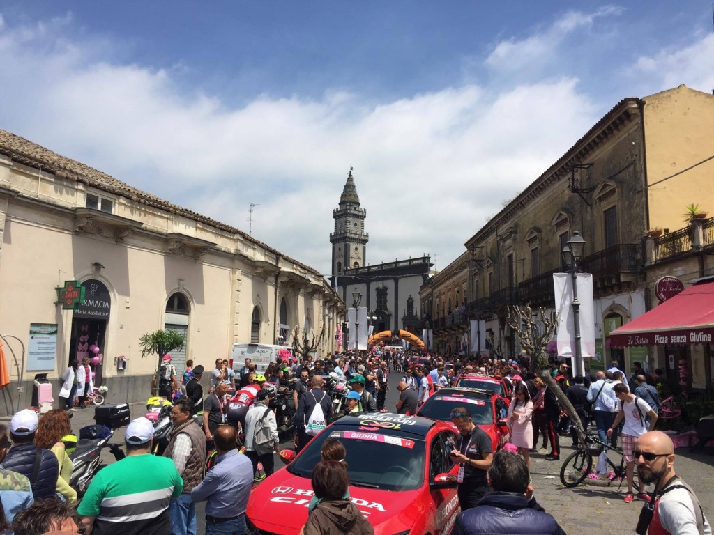 Sta partendo proprio in questi minuti la quinta tappa del giro d’italia che oggi arriverà a Messina. Grande festa alle falde dell’Etna nel centro abitato di Pedara per il gruppo di corridori che si è avvicinato al foglio firma letteralmente tra due ali di folla, diverse migliaia di persone hanno riempito il centro storico della città etnea, tributando il loro omaggio ai corridori e a tutto il gruppo ma soprattuto allo squalo dello Stretto, Vincenzo Nibali, autentico beniamino di casa, tanti gli striscioni per lui ma soprattutto tantissimi tifosi che hanno assediato il pullman del team Bahrain Merida sin dalle prime ore del mattino.