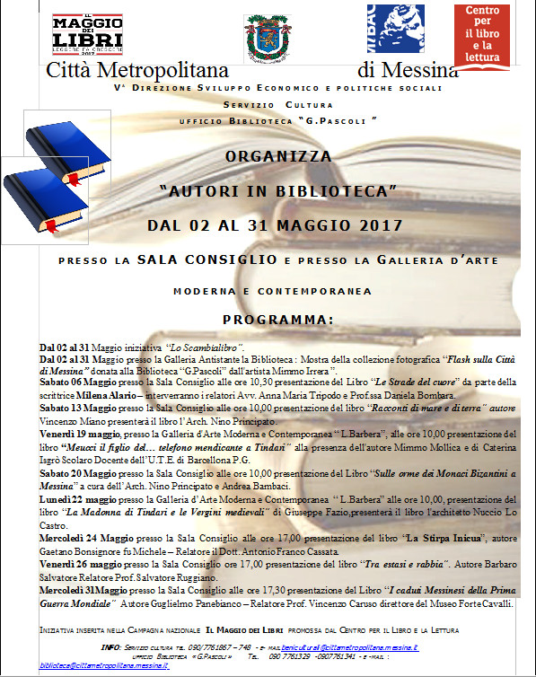La Città Metropolitana di Messina anche quest’anno ha aderito alla manifestazione, nata nel 2011 con l’obiettivo di sottolineare il valore sociale della lettura nella crescita personale, culturale e civile e giunta quest’anno alla VII Edizione. Vasto è il programma delle iniziative che hanno avuto inizio il 2 maggio e che fino al 31 maggio 2017 saranno realizzate nella Sala Consiglio di Palazzo dei Leoni e nella Galleria d’Arte Moderna e Contemporanea “Lucio Barbera”.