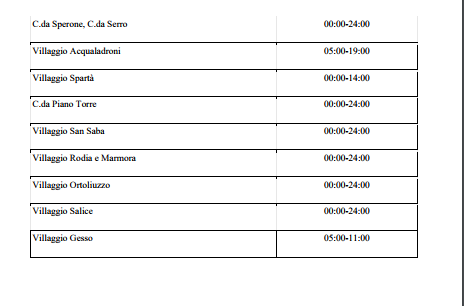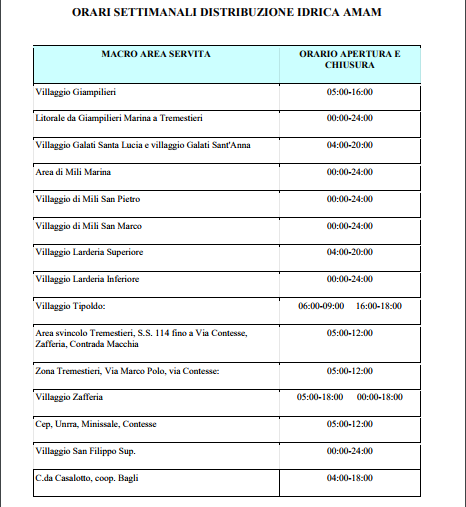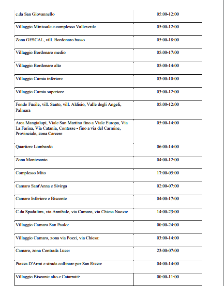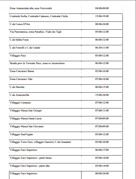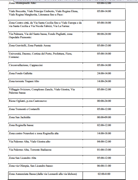 Le zone urbane e periferiche maggiormente interessate dalla diversa distribuzione saranno: Spartà, Corsari, Piano Torre, Calamona, le ‘Annunziate’ (Alta e Bassa) e le zone del centro città servite dai serbatoi di Montesanto, Tremonti, Paradiso, i cui impianti sono stati appena ripristinati dai tecnici.