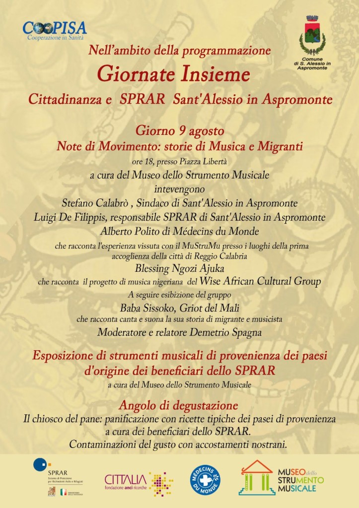 Giorno 9 agosto, ore 18, appuntamento a Sant’Alessio in Aspromonte per l’evento che il Progetto S.P.R.A.R. organizza insieme con il Museo dello Strumento Musicale per celebrare la Musica quale elemento di aggregazione e di riscatto sociale. Lo SPRAR (Sistema di protezione per richiedenti asilo e rifugiati) è costituito dalla rete degli enti locali che per la realizzazione di progetti di accoglienza integrata accedono, nei limiti delle risorse disponibili, al Fondo nazionale per le politiche e i servizi dell’asilo. A livello territoriale gli enti locali, con il prezioso supporto delle realtà del terzo settore, garantiscono interventi di “accoglienza integrata” che superano la sola distribuzione di vitto e alloggio, prevedendo in modo complementare anche misure di informazione, accompagnamento, assistenza e orientamento, attraverso la costruzione di percorsi individuali di inserimento socio-economico.