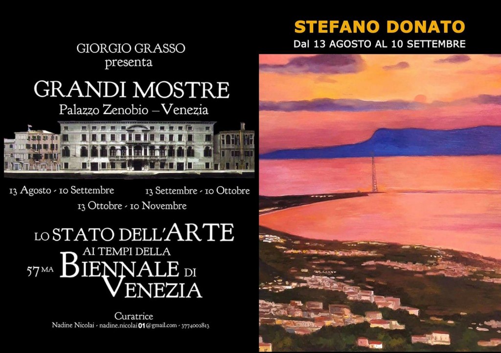 L’artista messinese Stefano Donato dopo aver vinto numerosi premi per il suo operato artistico metterà in mostra i suoi dipinti nella collettiva d’arte alla Biennale di Venezia 2017. La mostra d’arte si svolgerà a “Palazzo Zenobio” Padiglione Armenia, ospiti del noto artista Miro Persolja, con la collaborazione di Nadine Nicolai. curatore della manifestazione il noto critico Giorgio Grasso, Storico e Critico d’Arte, Presidente della Fondazione di arte contemporanea, e Fondatore della Galleria Mag Mediolanum Art Gallery. Stefano Donato vincitore di numerosi premi e riconoscimenti per la pittura sta ricevendo molti consensi per il suo operato artistico. La sua pittura si caratterizza per la realizzazione di atmosfere magiche e affascinanti, che richiamano quel forte amore per la propria terra natia. Le sue tele vengono appassionatamente dipinte da emozioni che sprigionano colori e prendono spunto dalla cultura dell’artista fatta di grandi passioni e sensibilità verso la vita.
