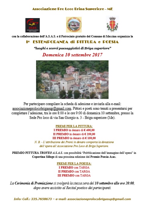 Tutto pronto per l’ VIII Raduno Poetico che si svolgerà il 24 settembre 2017 nel cuore della Sicilia. All’estemporanea di Pittura e Poesia “luoghi e scorci paesaggistici di briga superiore” possono partecipare tutti i poeti e gli artisti, che invieranno la richiesta di adesione entro il 30 agosto 2017 all’indirizzo e-mail: associazioneprolocobrigasup@gmail.com compilando la relativa scheda e che regolarizzeranno la loro iscrizione, firmando o facendo timbrare le proprie tele per la partecipazione, la mattina del 10 settembre 2017 dalle ore 8,00 alle ore 9,00, presso la Sede della Pro Loco di Briga Superiore in via San Giorgio n. 3 – Messina.