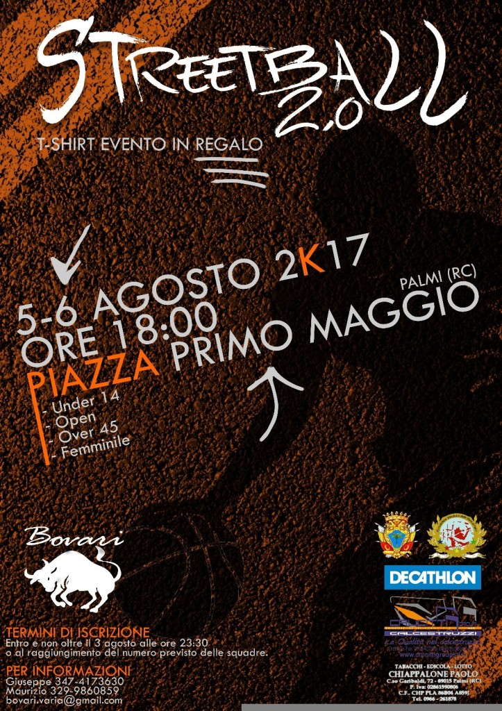 Inizia oggi lo Streetball 2.0, torneo di basket di strada organizzato dalla Corporazione dei Bovari della Varia di Palmi con il Patrocinio del Comune di Palmi. Per due giorni si sfideranno in Piazza Primo Maggio, eccezionalmente trasformata in terreno di gioco, squadre da 3 appartenenti a diverse categorie: Under 14, Open, Over 45 e Femminile.