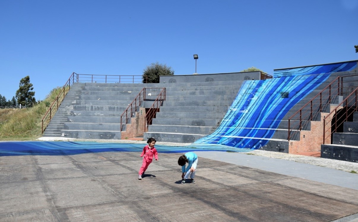 Le onde, dipinte in tutte le varianti colore del blu, si poggiano sulla struttura dell’anfiteatro, in maniera libera e imprevista. Così come è imprevisto il viaggio che i “migranti” affrontano, tra insidie e di pericoli, nella speranza di incontrare onde buone.