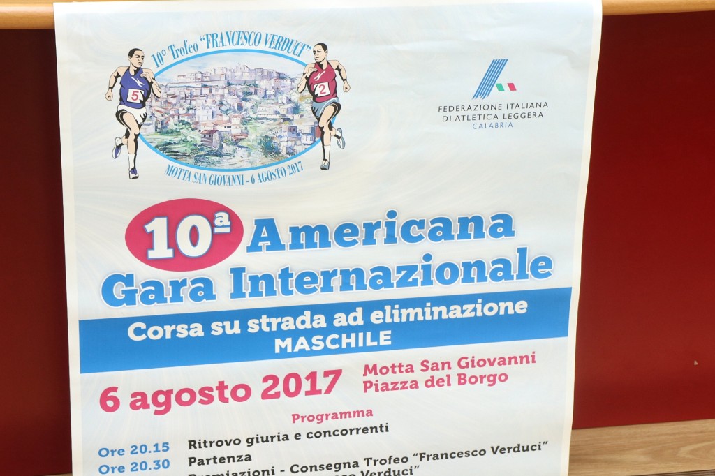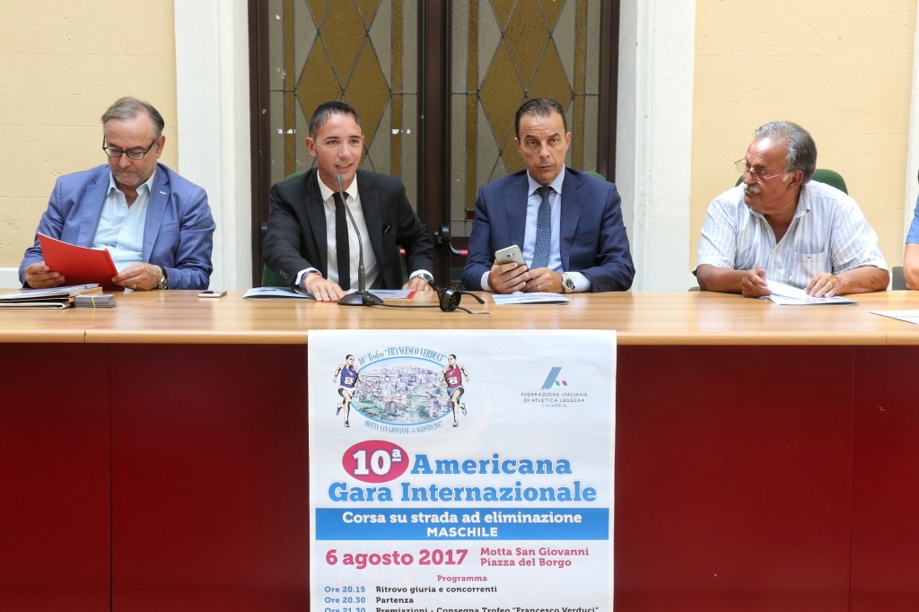 Presentata questa mattina la decima edizione dell’Americana Gara Internazionale – Trofeo Francesco Verduci, in programma a Motta San Giovanni domani domenica 6 agosto. La gara si svolge nel centro storico di Motta. I podisti partono tutti insieme ad andatura limitata. Ad ogni giro nel tratto conclusivo, viene lanciato uno sprint e gli atleti devono aumentare l’andatura per evitare l’eliminazione, ad eccezione dell’ultimo giro quando i podisti rimasti in gara disputano un rush finale di circa 300 metri, per aggiudicarsi la vittoria. La gara è riservata ad atleti di grande prestigio, italiani e stranieri, appartenenti alle categorie assoluti e master.