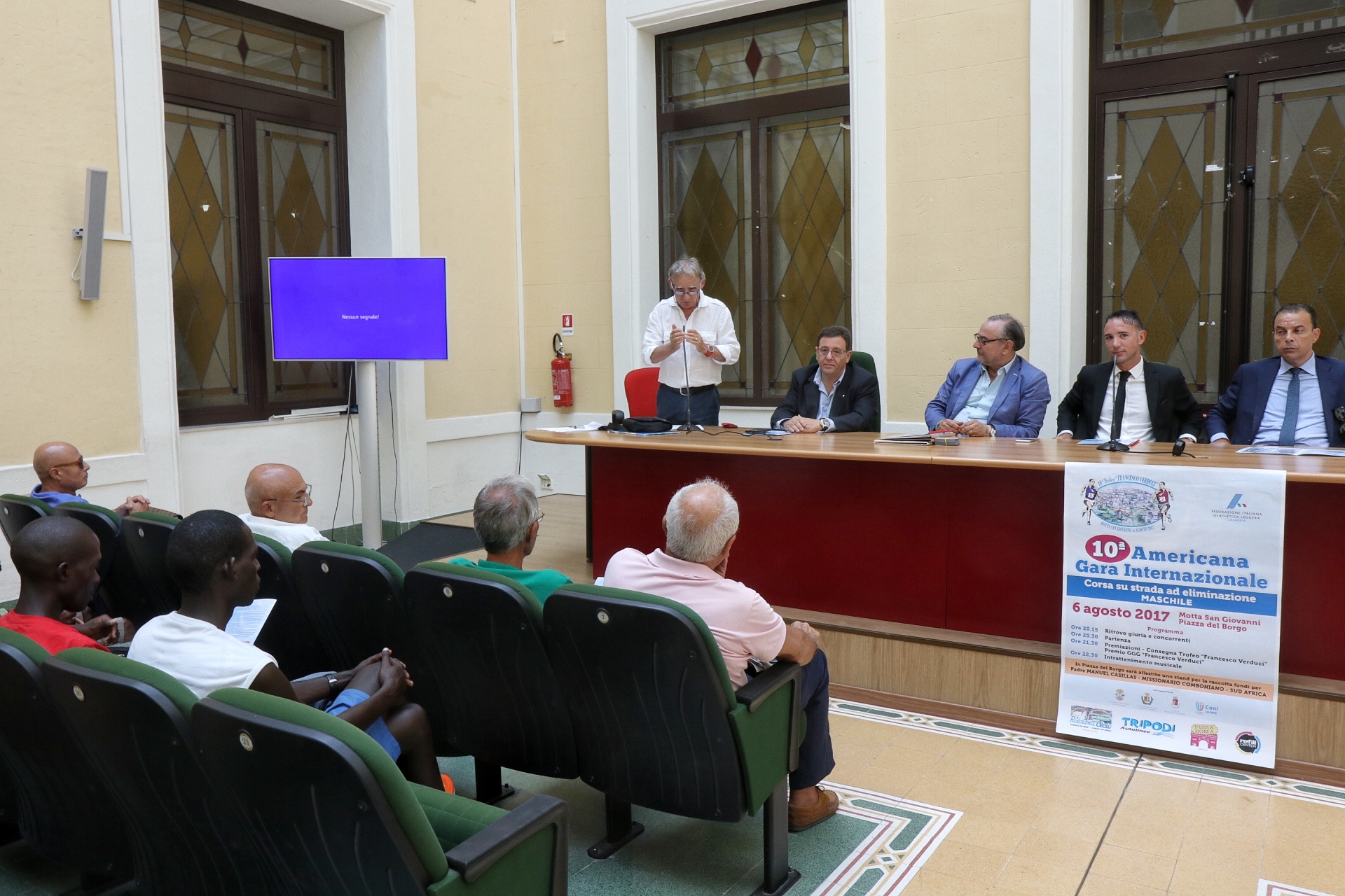 Presentata questa mattina la decima edizione dell’Americana Gara Internazionale – Trofeo Francesco Verduci, in programma a Motta San Giovanni domani domenica 6 agosto. La gara si svolge nel centro storico di Motta. I podisti partono tutti insieme ad andatura limitata. Ad ogni giro nel tratto conclusivo, viene lanciato uno sprint e gli atleti devono aumentare l’andatura per evitare l’eliminazione, ad eccezione dell’ultimo giro quando i podisti rimasti in gara disputano un rush finale di circa 300 metri, per aggiudicarsi la vittoria. La gara è riservata ad atleti di grande prestigio, italiani e stranieri, appartenenti alle categorie assoluti e master.