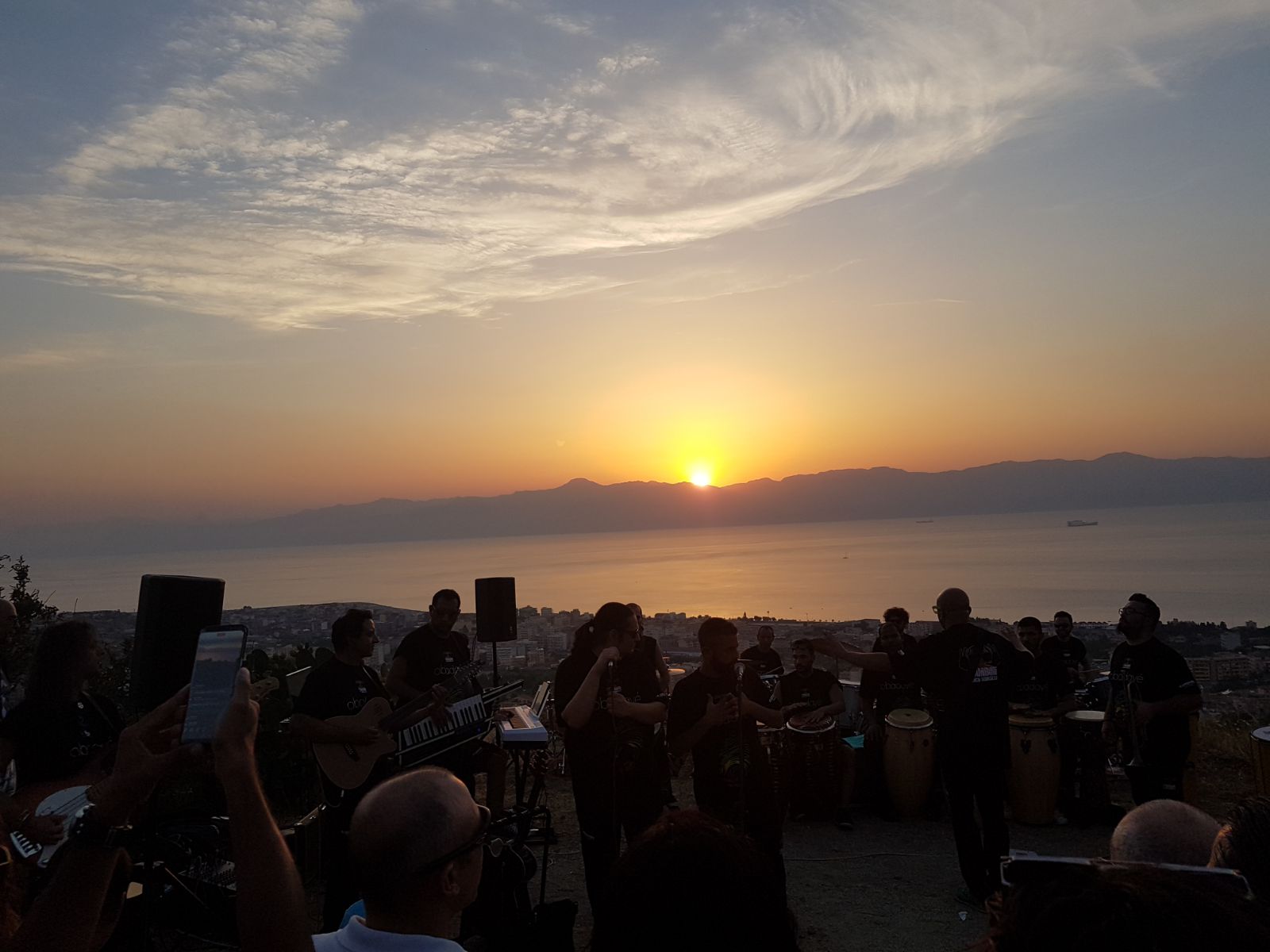 Si è conclusa la ventiseiesima edizione di Ecojazz. Un’unica lunghissima giornata scandita da sette eventi iniziati con l’alba della Torre Nervi e terminati al tramonto della Loggia di Pellaro passando per l’arena all’aperto di Ecolandia. Un viaggio che è rimbalzato dal centro alle periferie in un unico grande abbraccio a tutta la città. Ieri, al sole che scendeva oltre i monti peloritani, Giovanni Laganà e i diciassette scalmanati tamburi di Luca Scorziello abbarbicati sulla Loggia, lo sperone di roccia che domina Pellaro e la sua baia, hanno affidato “l’urlo del Tramonto sul Mediterraneo” per suggellare nella forza della natura l’eco di un evento che vuole travalicare i confini angusti della città e proiettarsi verso l’Africa e le Americhe ricordando quanti artisti provenienti da quei continenti hanno aderito con entusiasmo al progetto di Laganà teso a “salvare il mondo con la bellezza”. Richiami di libertà, di rabbia e di lotta per non arrendersi alle brutture che ci circondano, per reagire all’appiattimento e all’apatia.