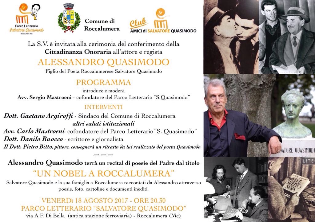 Il Comune di Roccalumera conferirà in una solenne cerimonia la Cittadinanza Onoraria all’attore e regista Alessandro Quasimodo, figlio del Poeta e Premio Nobel Salvatore e della danzatrice Maria Cumani. La cerimonia si terrà venerdì 18 agosto alle ore 20.30, presso il Parco Letterario Salvatore Quasimodo che ha sede nell’antica stazione ferroviaria di Roccalumera. Durante la serata Alessandro Quasimodo terrà un recital di poesie del padre, dal titolo “Un Nobel a Roccalumera” , nel corso del quale racconterà il costante rapporto tra la famiglia Quasimodo e Roccalumera e saranno presentanti alcuni documenti inediti che testimoniano la presenza della sua famiglia a Roccalumera ( Vincenzo Quasimodo , nonno del Poeta e bisnonno di Alessandro fu vicesindaco di Roccalumera tra la fine dell’Ottocento e l’inizio del Novecento). Alla cerimonia interverranno numerose autorità tra cui il Sig. Sindaco Gaetano Argiroffi , l’assessore alla Cultura Dott. Sebastiano Foscolo, il Presidente del Consiglio Comunale , i Capigruppo Consiliari , lo scrittore e giornalista Danilo Ruocco e i fratelli Carlo e Sergio Mastroeni fondatori del Parco Letterario Quasimodo che ogni anno attira moltissimi turisti e studiosi a Roccalumera, nei luoghi dove Salvatore Quasimodo trascorse gli anni dell’infanzia e della giovinezza nella casa familiare in via Umberto I e dove tornava per riabbracciare i propri cari quando si era trasferito al Nord. Alessandro Quasimodo nei suoi recitals e opere ha sempre portato il nome di Roccalumera nel mondo attraverso i componenti poetici del padre , ed ha dato il suo fondamentale apporto per la creazione del Parco Letterario a Roccalumera . Dalle 20.30 in poi sarà la cerimonia sarà trasmessa in diretta Facebook sulle pagine “Parco Letterario Salvatore Quasimodo” e su “Comune di Roccalumera – Pagina Istituzionale”.