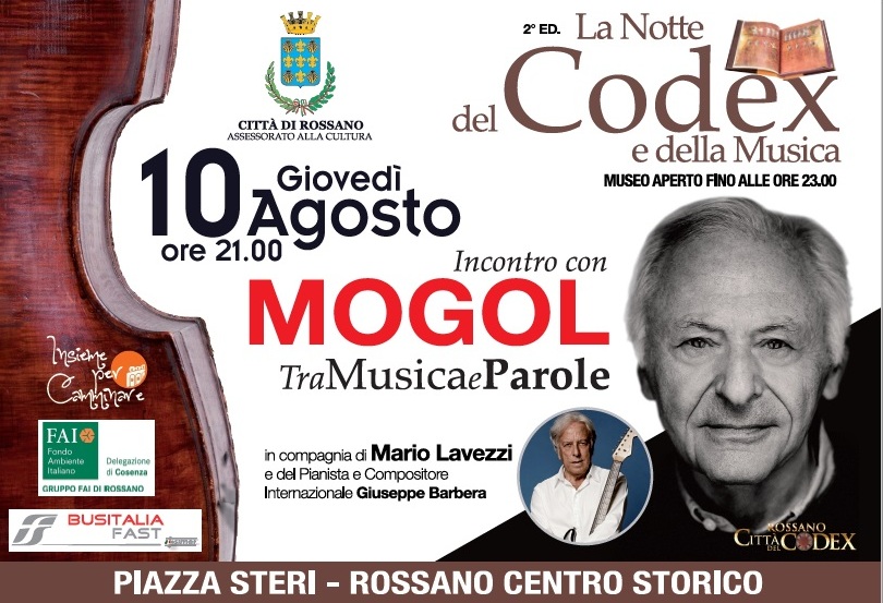 2° edizione della NOTTE DEL CODEX E DELLA MUSICA: GIOVEDÌ 10 AGOSTO l’incontro tra MUSICA E PAROLE con MOGOL si terrà alle ORE 21 in Piazza STERI. La location è stata scelta appositamente per poter consentire a tutti di poter fruire di questo momento culturale. Ad accompagnare l’Autore saranno Mario LAVEZZI ed il pianista e compositore internazionale Giuseppe BARBERA.