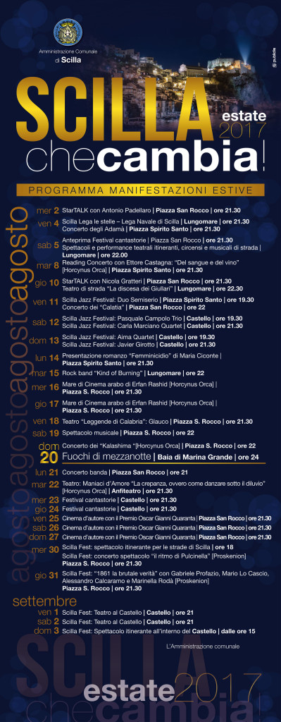 Dopo il grande successo della serata finale di StarTalk con il magistrato Nicola Gratteri, che ha richiamato tantissime persone in Piazza San Rocco, il calendario degli eventi è ripartito con lo Scilla Jazz Festival che, dopo la prima serata a Piazzetta Spirito Santo, prevede quattro concerti questa sera 12 agosto e domani 13 agosto al Castello Ruffo (a partire dalle 19 e 30). Spazio importante alla musica leggera e popolare con i concerti che si terranno a Ferragosto sul Lungomare (Kind of Burning), sabato 19 e domenica 20 (Kalashima) a Piazza San Rocco. Il Castello Ruffo ospiterà il Festival dei Cantastorie nei giorni 23 e 24 agosto, mentre il teatro sarà di scena il 18 e il 22 agosto. Il cinema sarà ancora grande protagonista a Scilla mercoledì 16 e giovedì 17 con Mare di cinema arabo di Erfan Rashid a Piazza San Rocco, e nei giorni 25, 26 e 27 agosto con la rassegna Scilla cinema d’autore, che vedrà come ospite fisso delle tre serate il Premio Oscar Gianni Quaranta insieme a grandi nomi della cultura e del cinema, con i dibattiti che saranno seguiti dalla proiezione di tre film pluripremiati su temi di grande impatto sociale. A partire dalla settimana successiva, dal 30 agosto al 3 settembre, lo Scilla Fest con concerti, spettacoli itineranti e teatro.