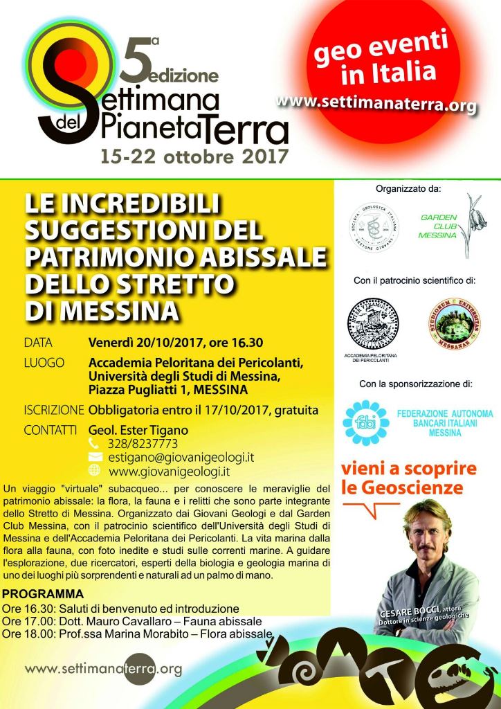 In occasione della V Edizione della Settimana del Pianeta Terra, i Giovani Geologi della Sicilia con la collaborazione e partnership del Garden Club di Messina organizzano una Conferenza su “Le incredibili suggestioni del patrimonio abissale dello Stretto di Messina” presso l’Accademia Peloritana dei Pericolanti, con il patrocinio scientifico della stessa e dell’Università di Messina, con il contributo oneroso della F.A.B.I. (Federazione Autonoma Bancari Italiana).