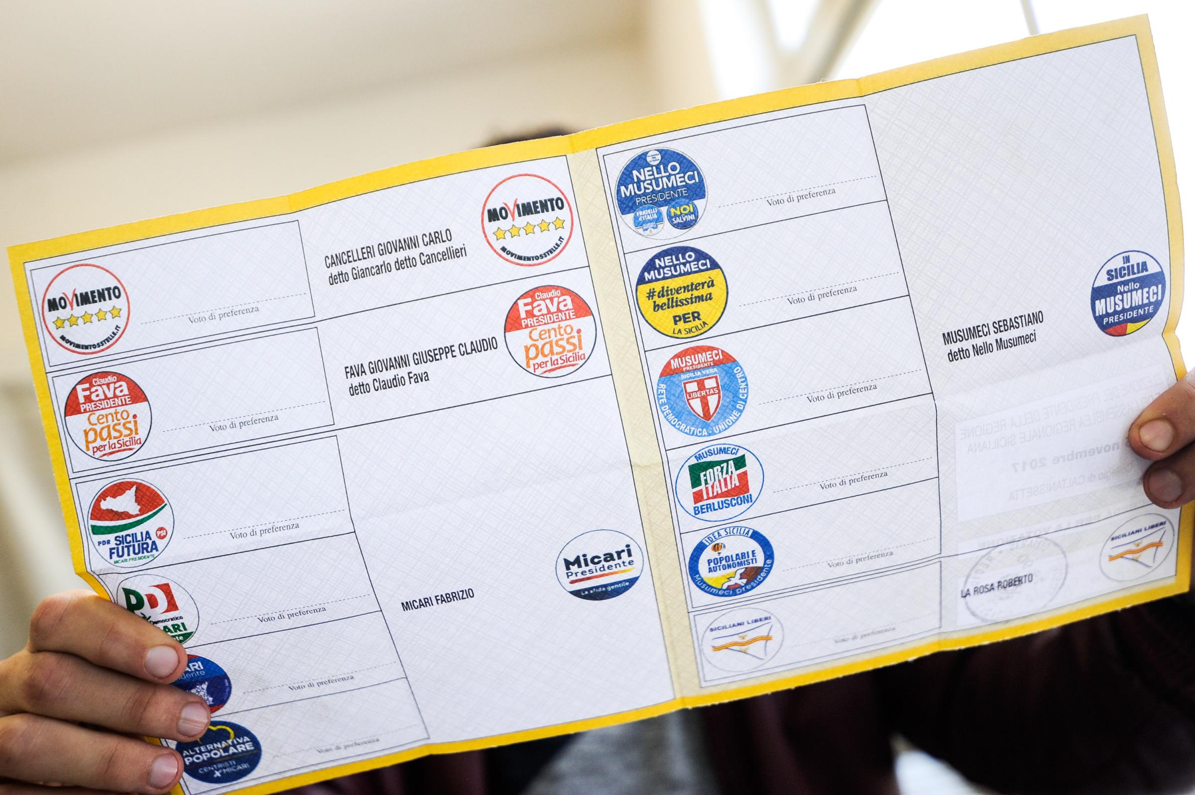 Se le proiezioni saranno confermate dal risultato reale, il centrodestra al 37% potrebbe non avere la maggioranza in Consiglio regionale. La legge elettorale siciliana assegna al Presidente vincente solo 6 seggi di premio di maggioranza su 70 consiglieri. La legge elettorale non prevede infatti il ballottaggio ed e’ possibile che chi verra’ eletto presidente (il piu’ votato, senza alcun quorum minimo) debba poi cercare alleanze per avere una maggioranza in Assemblea regionale. Potrebbe accadere che anche attribuendo l’intero premio di maggioranza alla lista del candidato vincente, questa possa comunque non raggiungere la maggioranza dei 70 deputati (36 seggi), come accadde nel 2012. Per garantire la governabilita’ della Giunta, sarebbe cosi’ necessario allargare la coalizione vincente ad altre forze politiche. Il Parlamento siciliano avra’ 62 deputati su 70 scelti attraverso liste provinciali e un eventuale voto di preferenza, con un sistema proporzionale per collegio e uno sbarramento del 5% per ciascuna lista sul totale regionale dei voti validi espressi. Faranno parte dell’Ars anche il presidente della Regione eletto e il piu’ votato tra i candidati alla presidenza non eletti. Infine, i restanti 6 seggi andranno attribuiti come possibile premio di maggioranza, ma solo qualora le liste collegate al nuovo governatore non abbiano eletto almeno 42 deputati. I 62 consiglieri regionali eletti saranno cosi’ suddivisi tra le province: 16 a Palermo, 13 a Catania, 8 a Messina, 6 ad Agrigento, 5 a Siracusa, 5 a Trapani, 4 a Ragusa, 3 a Caltanissetta, 2 a Enna.