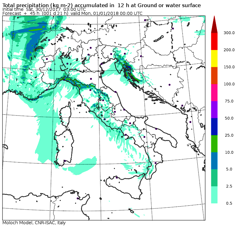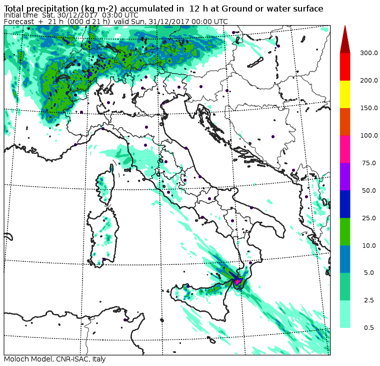 Allerta Meteo (da MeteoWeb) – Ancora maltempo in queste ore all’estremo Nord e all’estremo Sud Italia: è un ultimo Sabato del 2017 di instabilità sulle Alpi e nel basso Tirreno. Sulle Alpi sta nevicando copiosamente tra Francia e Svizzera, ma anche nelle zone di Valle d’Aosta e Trentino Alto Adige più vicine ai confini. Forte maltempo, invece, all’estremo Sud tra Sicilia e Calabria dove avremo ancora forti piogge e autentici nubifragi nel pomeriggio in modo particolare sull’Aspromonte (versante tirrenico), tra la piana di Gioia Tauro e la città di Reggio Calabria. Secondo l’ultimo aggiornamento del preciso modello Moloch dell’ISAC-CNR (vedi mappe a corredo dell’articolo), nella zona potranno cadere oltre 100mm di pioggia con autentiche alluvioni lampo. La temperature sta aumentando quindi anche la quota neve potrebbe alzarsi pericolosamente provocando una “valanga” di pioggia sui corsi d’acqua aspromontani. Massima allerta. Maltempo anche nella Sicilia tirrenica, dove continuerà a piovere anche nella notte specie nel messinese.