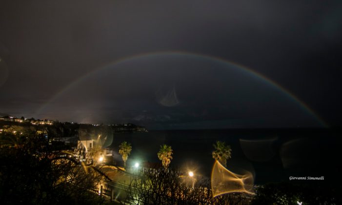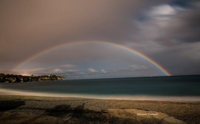 Un rarissimo arcobaleno lunare ha affascinato nella serata odierna la “Perla del Tirreno”, Tropea, in Calabria, dove imperversa il maltempo alternato a schiarite sotto la luna piena della notte. L’arcobaleno, in questo caso, è prodotto dalla luce riflessa sulla superficie della luna. E’ un fenomeno molto raro e di solito l’arcobaleno di debole intensità, invece stavolta nel caso di Tropea è stato davvero spettacolare come possiamo osservare nelle bellissime fotografie scattate da Giovanni Simonelli.