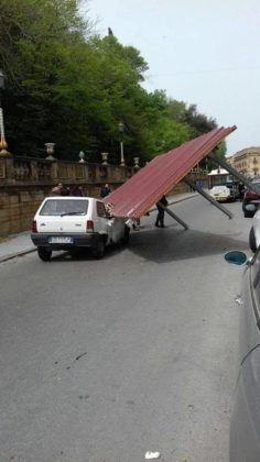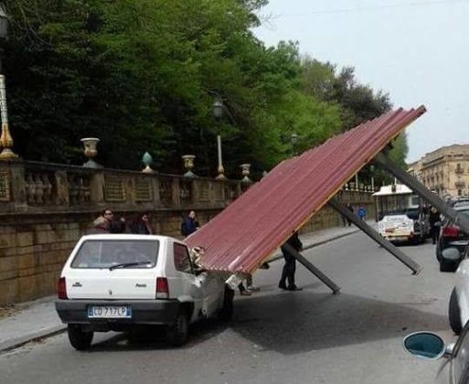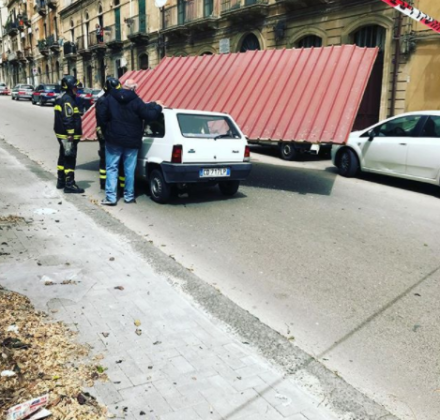 Maltempo – Il ciclone posizionato in Tunisia sta alimentando forte maltempo al Sud Italia, senza piogge ma con venti impetuosi che colpiscono soprattutto Sardegna e Sicilia. Stamattina le raffiche più forti hanno raggiunto addirittura i 122km/h a Capo Carbonara, 87km/h a Gela, 78km/h a Pantelleria, 70km/h a Lampedusa. Anche Malta è sferzata da impetuosi venti di levante che stanno provocando intense mareggiate. Danni in Sicilia per alberi sradicati, cartelloni e impalcature crollate. Tragedia sfiorata a Caltagirone (vedi foto a corredo dell’articolo) dove un’auto in transito è stata colpita dalla copertura di una struttura staccata proprio dal forte vento. Ecco qualche video: