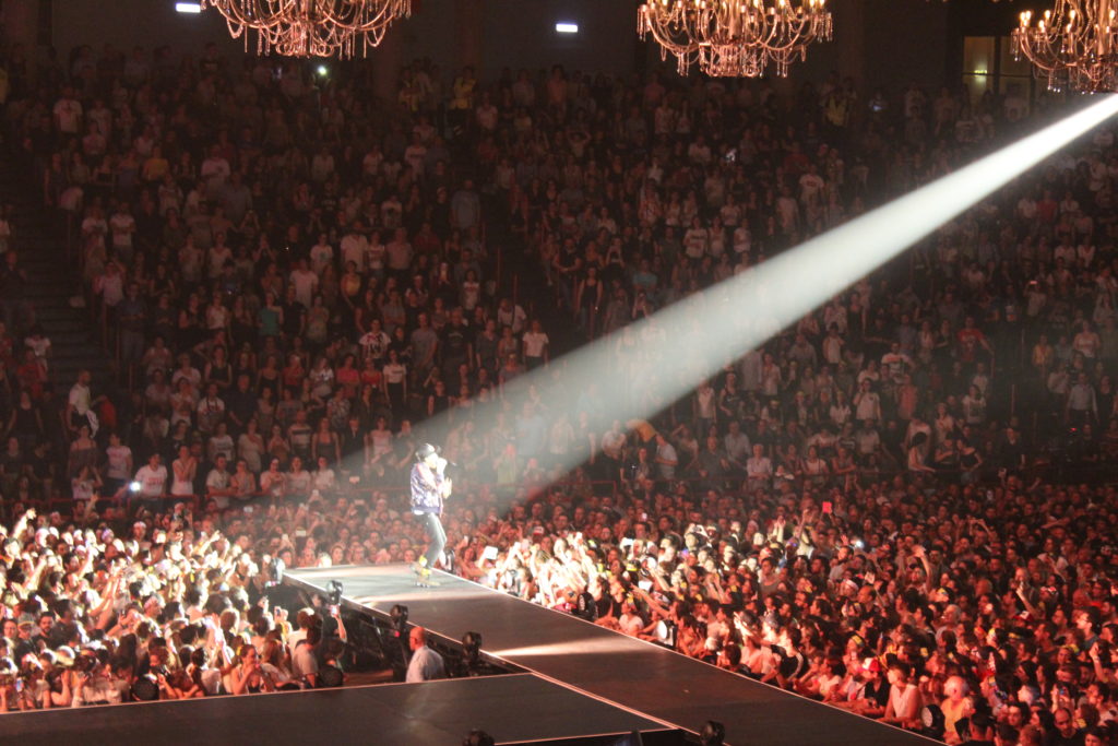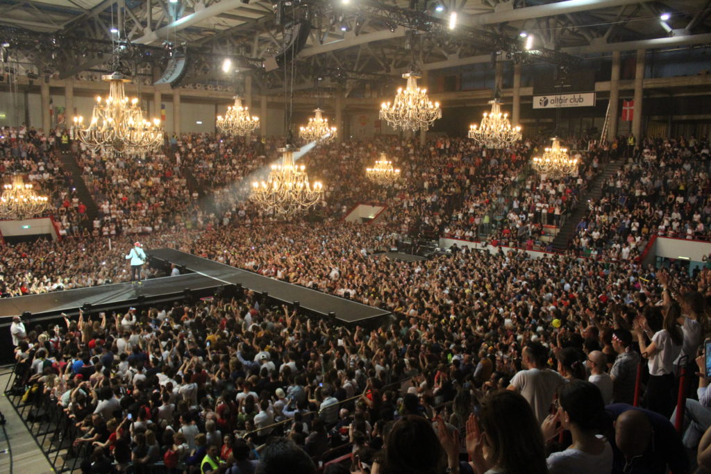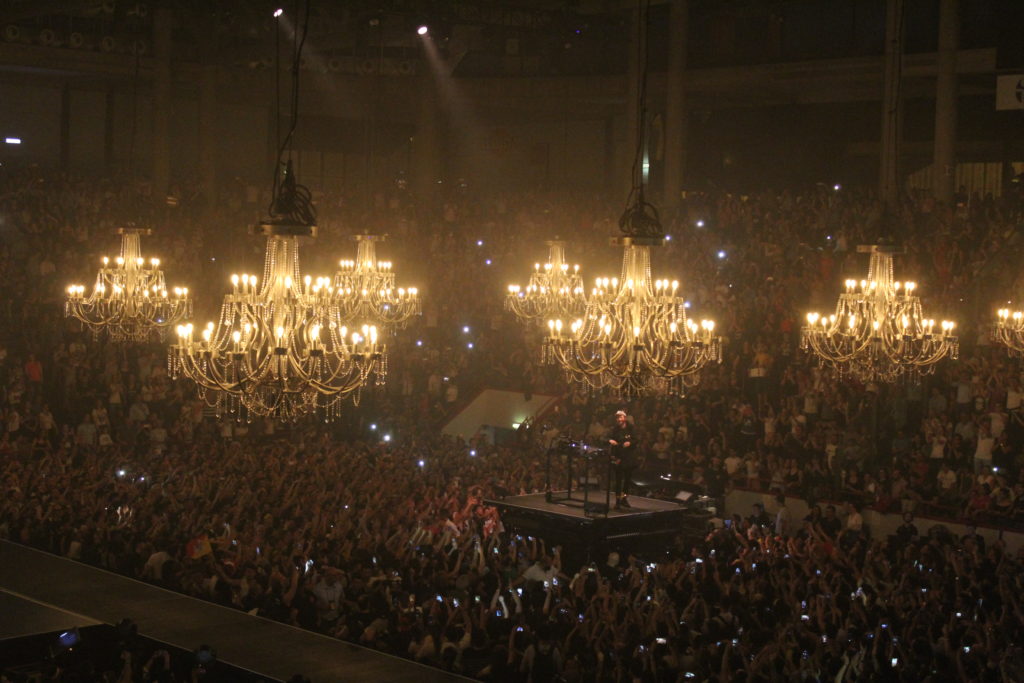 La serata inizia subito con il giusto ritmo e la sua “Ti porto via con me” fa scaldare immediatamente la platea che da quel momento non si fermerà più. Arredamento di scena spettacolare con un palco mobile che attraversa il parterre e che durante lo spettacolo si solleva creando un effetto scenico mozzafiato. Dal soffitto vengono giù eleganti e sfavillanti lampadari illuminati, che rendono magica l’atmosfera durante alcuni pezzi in acustica come: A te, Chiaro di luna o Baciami ancora.