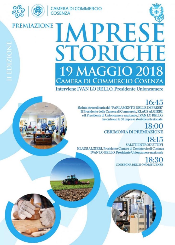 La seconda edizione del “Premio Imprese Storiche” in programma sabato 19 maggio 2018, a partire dalle ore 18:00, nella Sala Mancini della Camera di Commercio di Cosenza. La cerimonia sarà anticipata da una seduta straordinaria del Parlamento delle imprese alla presenza di Ivan Lo Bello, presidente nazionale di Unioncamere e di Klaus Algieri, presidente della Camera di Commercio di Cosenza. Le trentuno aziende storiche selezionate formuleranno domande e proposte durante questo importante strumento di ascolto e condivisione che fa parte di #OpenCameraCosenza, la svolta culturale e organizzativa introdotta dal presidente Algieri. Anche in questa seconda edizione del Premio la Camera di Commercio di Cosenza riconosce il valore e l’operosità di 31 imprese storiche del territorio. Donne e uomini che hanno conservato e trasmesso nel tempo la passione per il proprio lavoro, superando difficoltà e raccogliendo soddisfazioni per quello che è oggi un patrimonio di tutta la provincia. La Camera di Commercio di Cosenza intende promuovere i valori storici della cultura d’impresa. Il premio attesta il valore di tutti quegli imprenditori e quelle imprenditrici che continuano a contribuire allo sviluppo economico della provincia di Cosenza, nonostante la complessità della congiuntura economica. Il premio consiste nel rilascio un diploma di benemerenza e la consegna della medaglia d’oro, nonché la possibilità di utilizzare il marchio di “Impresa storica”. La celebrazione dei casi di successo imprenditoriale e l’eco del riconoscimento pubblico dell’orgoglio di fare impresa sono eccezionali strumenti per veicolare un’immagine positiva del territorio e, in particolare, del sistema economico. Generando identità, valori, memoria, ricchezza e lavoro.