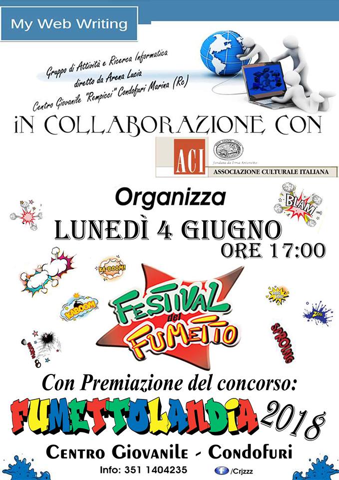 Si svolgerà il 4 giugno a partire dalle ore 17 presso il Salone del Centro Giovanile “Rempicci” la prima edizione: FESTIVAL DEL FUMETTO organizzata dal gruppo informatico My web writing guidato da Arena Lucia in collaborazione con l’Associazione Culturale Italiana. Durante il Festival sarà possibile sfogliare digitalmente i fumetti storici, ripercorrendo infine una costruzione cronologica delle più famose copertine si potrà votare nel concorso FUMETTOLANDIA 2018.
