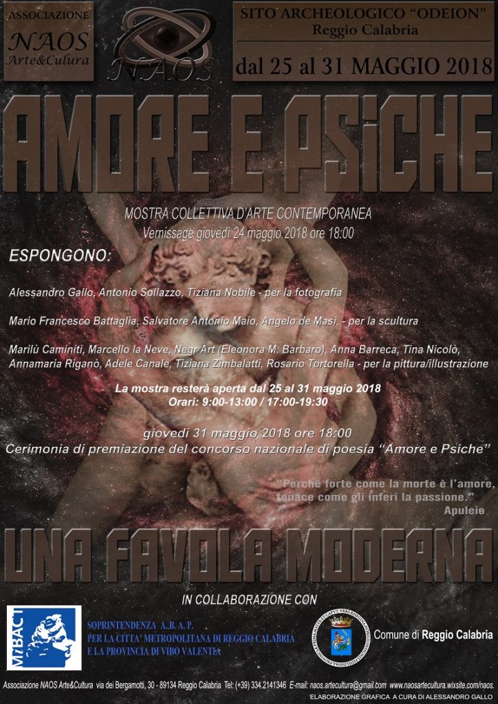 Un nuovo momento di incontro e dialogo tra le arti in stile NAOS Arte&Cultura è alle porte. Gli organizzatori dell’evento, Alessandro Gallo ed Eleonora Maria Barbaro (rispettivamente presidente e vicepresidente dell’associazione) – in collaborazione con il Comune di Reggio Calabria e la Soprintendenza archeologica delle arti e del paesaggio della Città Metropolitana di Reggio Calabria -, hanno creato un trait d’union tra passato e presente, non solo nella scelta del tema dell’evento, ma soprattutto nella presentazione di quest’ultimo presso il sito archeologico dell’Odeion in via XXIV maggio a Reggio Calabria. “Parlare di Amore e Psiche è parlare dell’intramontabilità dell’arte, e delle sue infinite possibilità interpretative nelle diverse espressioni artistiche in ogni tempo e in ogni luogo” – sottolineano gli ideatori del progetto espositivo, al quale hanno aderito: Alessandro Gallo, Antonio Sollazzo, Tiziana Nobile (per la fotografia); Antonio Salvatore Maio, Angelo de Masi, Francesco Mario Battaglia (per la scultura); Marilù Caminiti, Marcello la Neve, Negr Art, Tina Nicolò, Anna Barreca, Annamaria Riganò, Adele Canale, Tiziana Zimbalatti, Rosario Tortorella. La mostra sarà inaugurata giovedì 24 maggio ore 18:00, e si concluderà giovedì 31 maggio alla stessa ora con la premiazione dei vincitori del concorso nazionale di poesia connesso alla manifestazione. Nei giorni dal 25 al 31 maggio la mostra sarà aperta al pubblico dalle ore 9:00 alle 12:00 e dalle ore 17:00 alle 19:30.