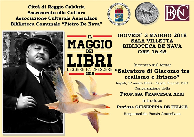 L’Associazione Culturale Anassilaos apre il “Maggio dei Libri 2018” con un omaggio a Salvatore Di Giacomo (Napoli, 12 marzo 1860 – Napoli, 5 aprile 1934) che si terrà giovedì 3 maggio alle ore 126,45 presso la Villetta della Biblioteca Pietro De Nava. Tema dell’incontro, promosso congiuntamente con il Comune di Reggio Calabria e la Biblioteca Comunale “Pietro De Nava”, sarà infatti “Salvatore Di Giacomo tra realismo e lirismo” che traduce uno degli aspetti fondamentali della sua vita e della sua arte. Da un lato troviamo infatti un senso drammatico della vita e dell’esistenza che confluisce in alcune opere teatrali (“Assunta Spina”, del 1910, la più celebre, anche per la trasposizione cinematografica che ebbe Eleonora Duse come protagonista, ma anche “‘O mese mariano”, del 1900 e “‘O voto”) e nelle “Novelle napolitane” che ebbero la prefazione di Benedetto Croce (1914) dall’altro una capacità di stemperare la realtà quotidiana, anche quella più amara, della sua Napoli, nel tono elegiaco della sua poesia, una lirica di grandissimo livello che fa di Di Giacomo una delle voi più alte della poesia italiana dell’Ottocento anche se considerata, fino all’intervento critico di Croce, tutto sommato marginale perché composta in vernacolo. Fu il critico napoletano a ribadire che la poesia è tale indipendentemente dalla lingua che il poeta utilizza. A introdurre il tema sarà la Prof.ssa Giuseppina De Felice, Responsabile Poesia Associazione Anassilaos. A parlare del grande poeta partenopeo, ingiustamente oggi dimenticato e certamente poco conosciuto dalle più giovani generazioni di lettori e poeti e pur meritevole di attenzione, sarà la Prof.ssa Francesca Neri.