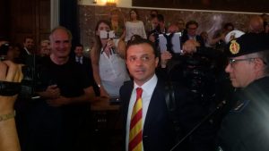 Palazzo Zanca gremito per la cerimonia di proclamazione del neo Sindaco di Messina Cateno De Luca. Questo pomeriggio il primo cittadino, che indossava per l’occasione una cravatta giallo-rossa in richiamo ai colori della città, accolto dagli applausi dei cittadini e anche di qualche neo consigliere comunale, ha fatto il suo ingresso nell’aula consigliare, accompagnato dalla sua famiglia e dai sette assessori della sua giunta.
