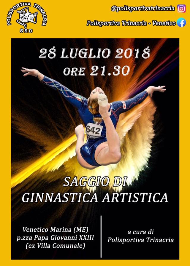 di Giovanni Remigare – Sarà la villa comunale di Venetico Marina il teatro dello spettacolo ginnico della Polisportiva Trinacria che si terrà sabato 28 luglio. Una serata dedicata all’amore per lo sport ed in particolare per la ginnastica artistica. Gli atleti della Trinacria, coadiuvati dai tecnici: Silvia Gismondo e Simona Gismondo, dalla coreografa Federica La Cava daranno saggio della loro bravura e della loro crescita sportiva. Alla serata, naturalmente, saranno presenti il Presidente della Polisportiva, il prof. Mimì Farsaci e il vice presidente Paolo Barberi. Si esibiranno tutte le cinque sezioni: Gymgiocando, Avviamento alla Ginnastica, Preagonisti, Sezione Ginnastica Artistica Maschile e la Sezione Ginnastica Artistica Femminile Agonista.