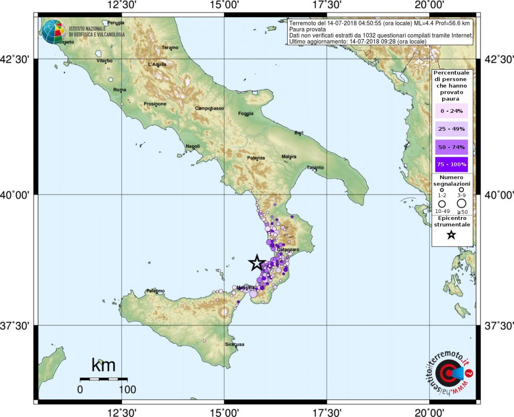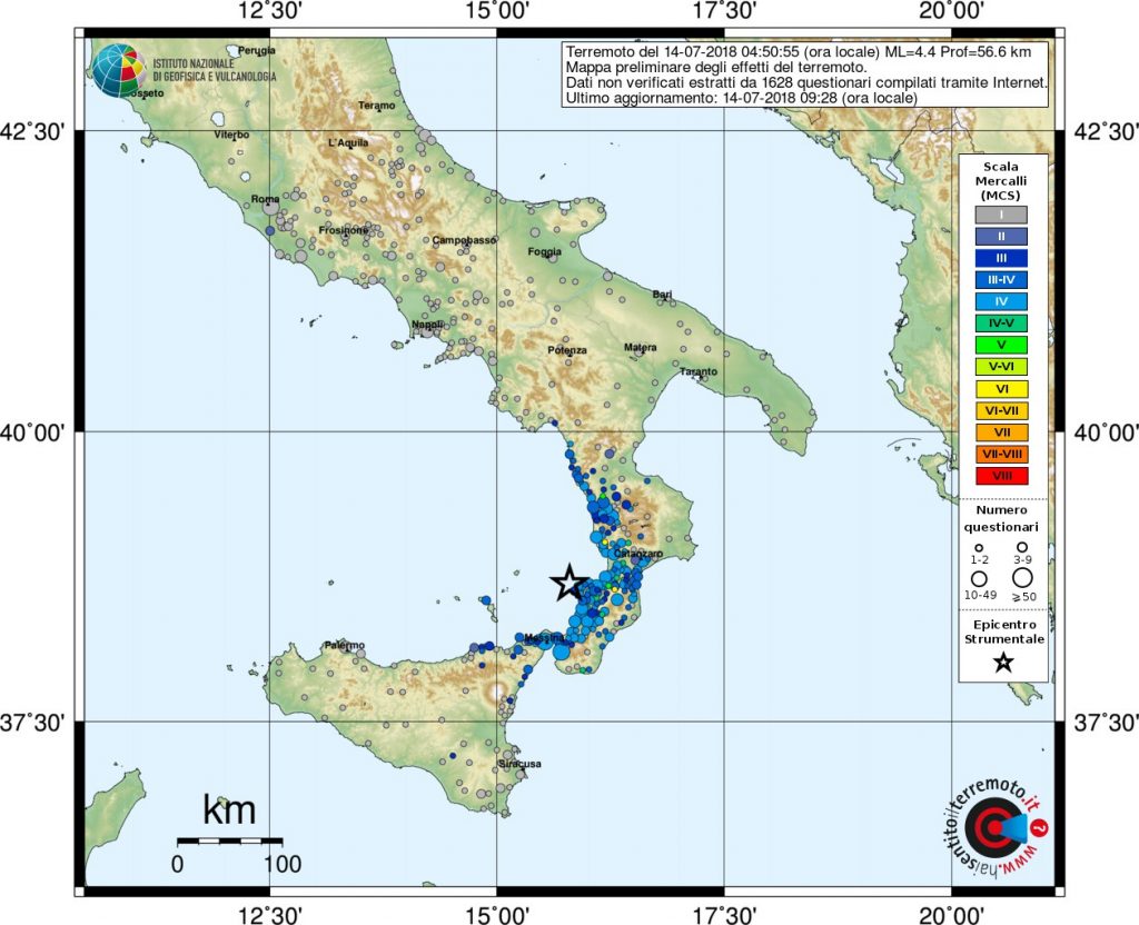 Il terremoto di magnitudo 4.4 che alle 04:50 di stanotte ha colpito la Calabria, con epicentro al largo di Ricadi e Tropea in provincia di Vibo Valentia nel mar Tirreno, è stata avvertita a grandissima distanza: addirittura fino a Roma, in Tunisia, Grecia e Albania. E’ successo perché la scossa s’è verificata a 56.6km di profondità, quindi le onde sismiche si sono propagate a grande distanza evitando così danni nel territorio calabrese più vicino all’epicentro, dove si è registrato un risentimento sismico del 6° grado sulla scala Mercalli in varie località della fascia tirrenica centrale della Calabria, tra le province di Cosenza, Catanzaro e Vibo Valentia. In zone molto più ampie, fino alle città di Messina, Reggio Calabria, Cosenza e Catanzaro, il risentimento sismico è stato del 5°/4° grado Mercalli.
