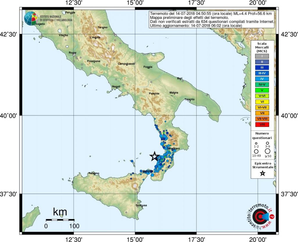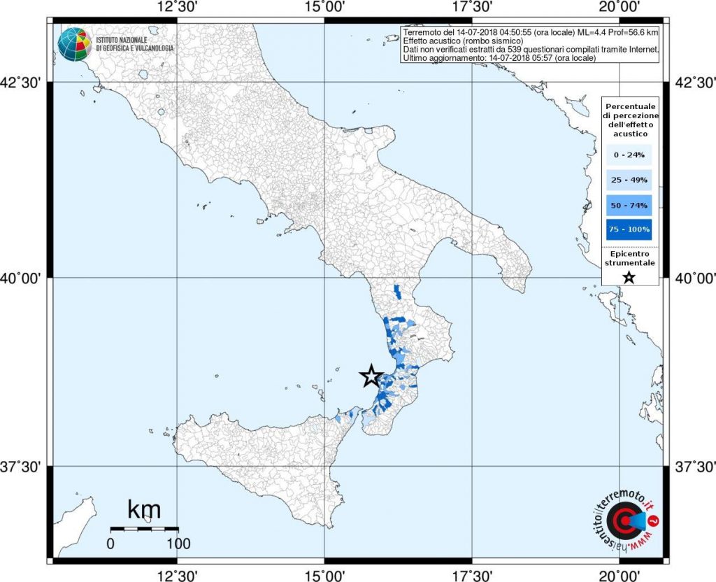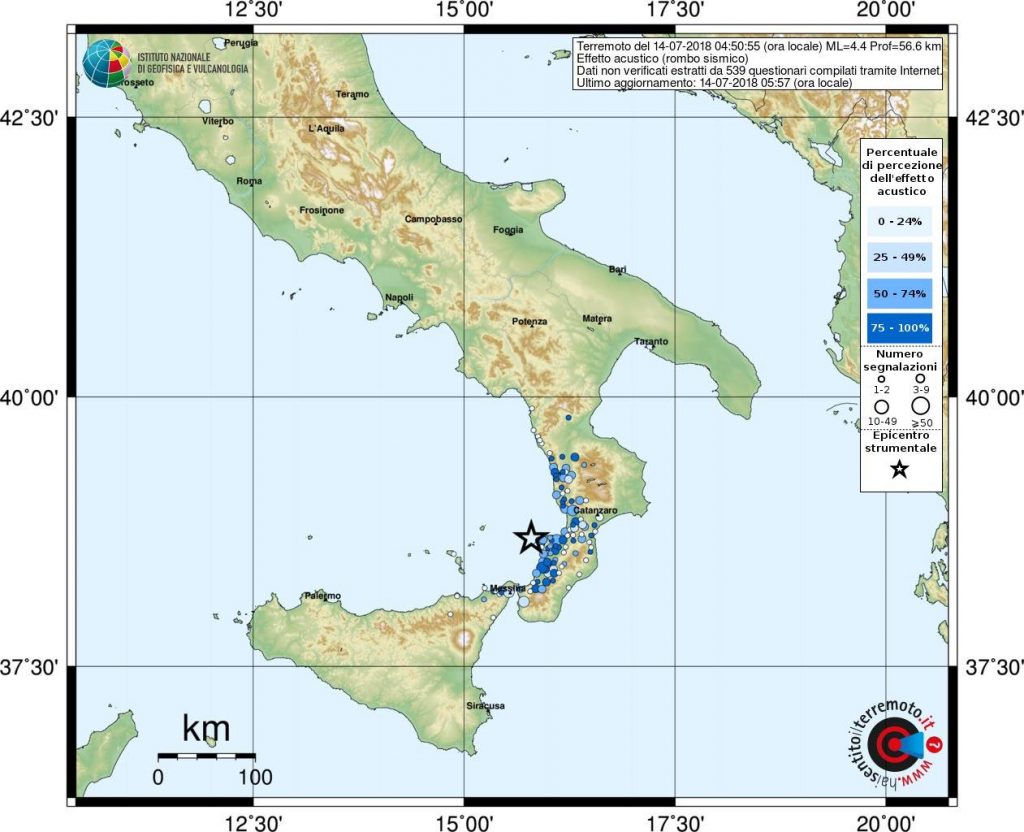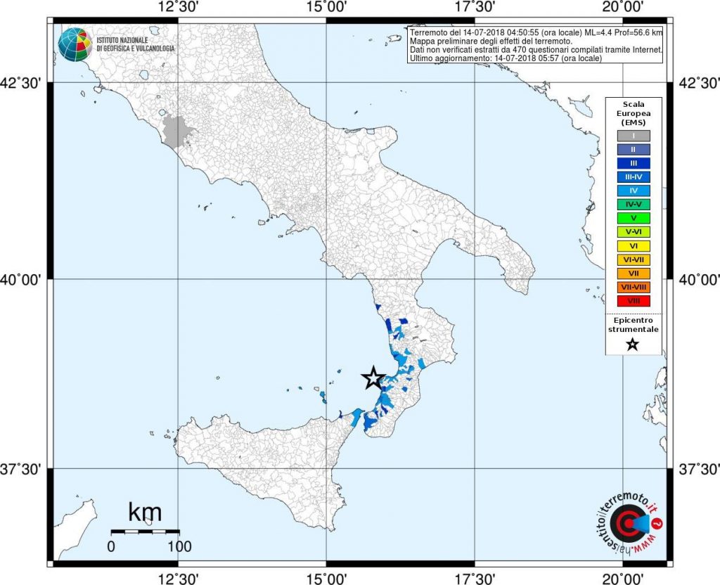 Una scossa di terremoto è stata avvertita dalla popolazione a Reggio Calabria e Messina. L’evento si è verificato alle 04:50. Secondo i dati INGV si è trattato di un terremoto magnitudo ML 4.4 localizzato nella Costa Calabra sud occidentale (Catanzaro, Vibo Valentia, Reggio di Calabria) ad una profondità di 57 km. Secondo i primi rilievi del Dipartimento della Protezione Civile al momento non si registrano danni a persone o cose, anche se sono state decine le telefonate ai centralini di vigili del fuoco e forze di polizia, in prevalenza dai paesi costieri in questo periodo affollati di turisti.