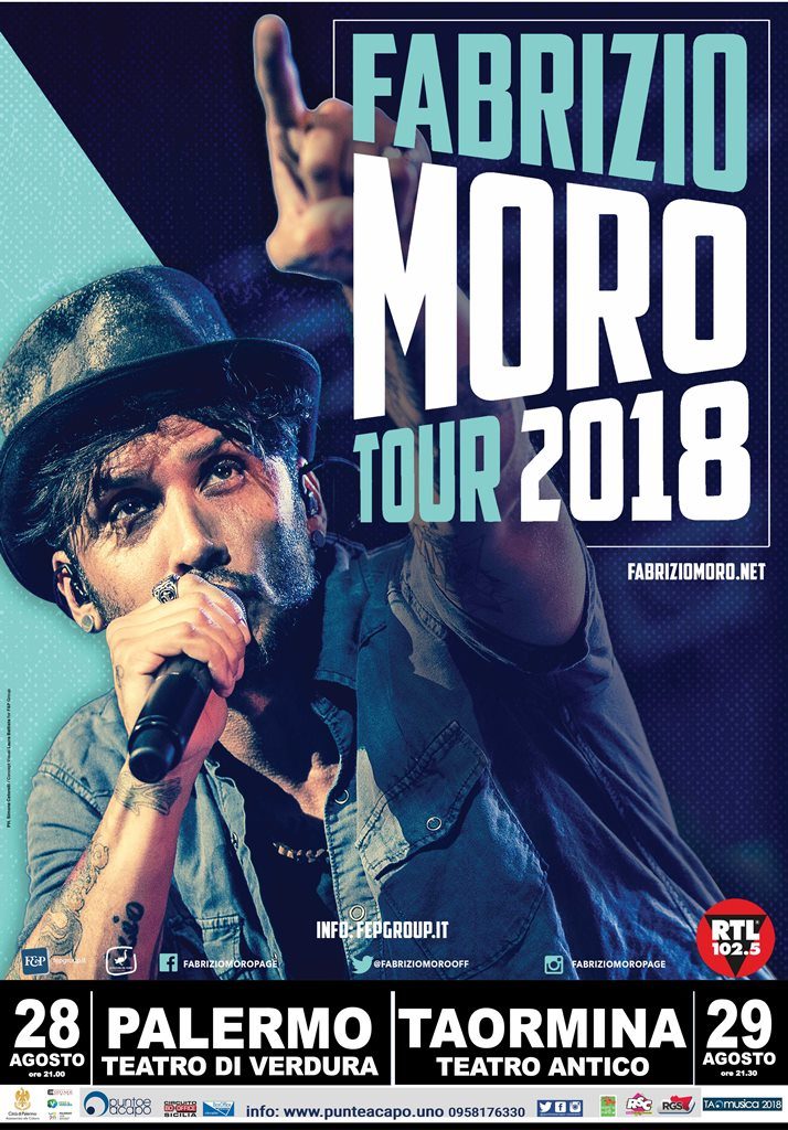 Continua con successo l’imperdibile tour estivo che sta portando il cantautore Fabrizio Moro, sui palchi di tutta Italia: domani martedì 28 agosto Palermo ore 21 (Estate al Verdura – Teatro di Verdura); mercoledì 29 agosto al Teatro antico di Taormina ore 21.30 (nell’ambito della rassegna TAOmusica 2018, con la direzione artistica di Nuccio La Ferlita).