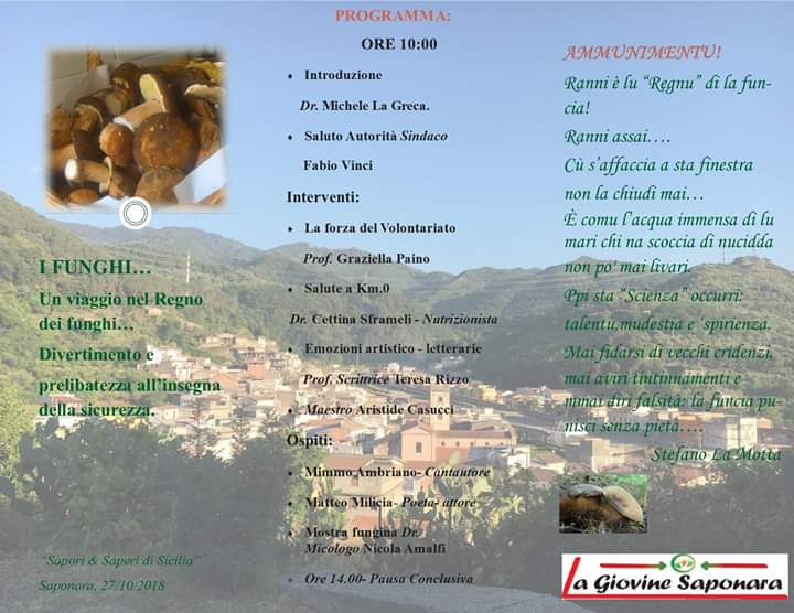 E’ quanto accaduto sabato mattina nell’Aula Consiliare del Comune di Saponara, dove Scienza e Letteratura si sono abbracciate in un valzer di conoscenza e poesia, conclusosi nella degustazione di specialità tipiche locali e nella scoperta di ben 98 specie fungine, esposte e catalogate dal Dott. Nicola Amalfi, noto Micologo dell’ASP di Messina.