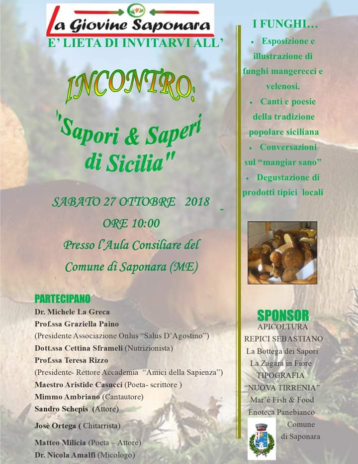 Entusiasmante e briosa la giornata “Sapori & Saperi di Sicilia”, organizzata sabato 27 ottobre presso la Sala Consiliare del Comune di Saponara dall’Associazione La Giovine Saponara.