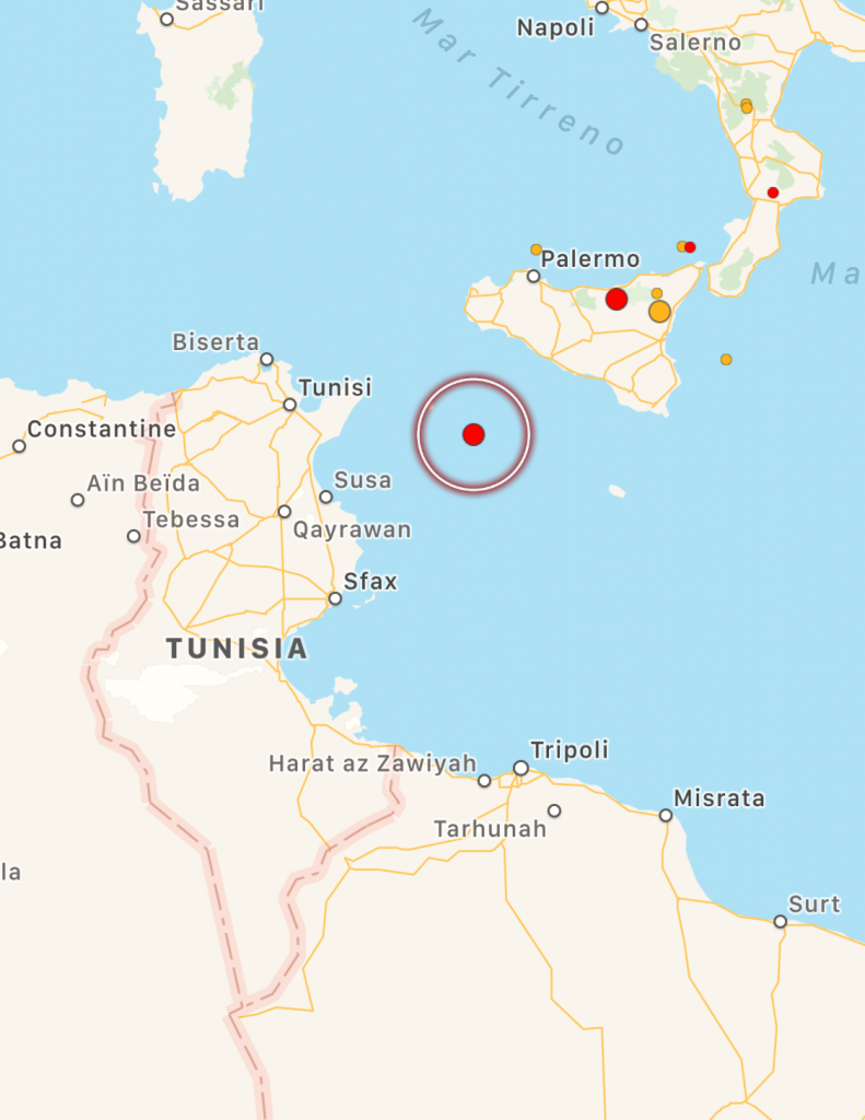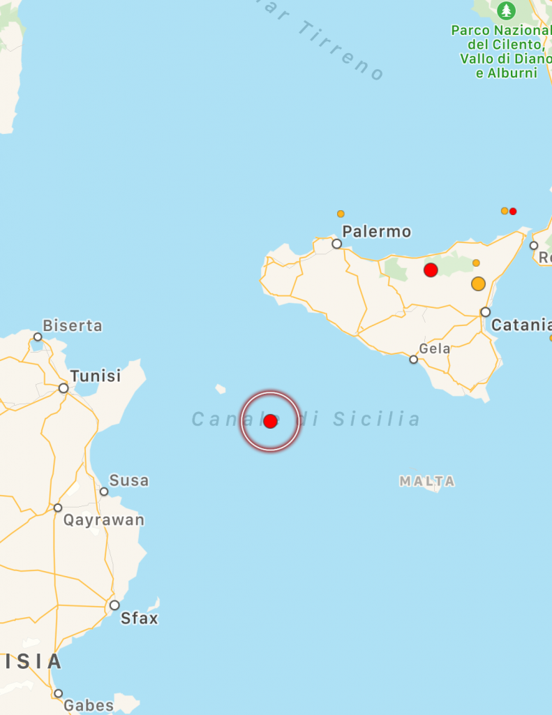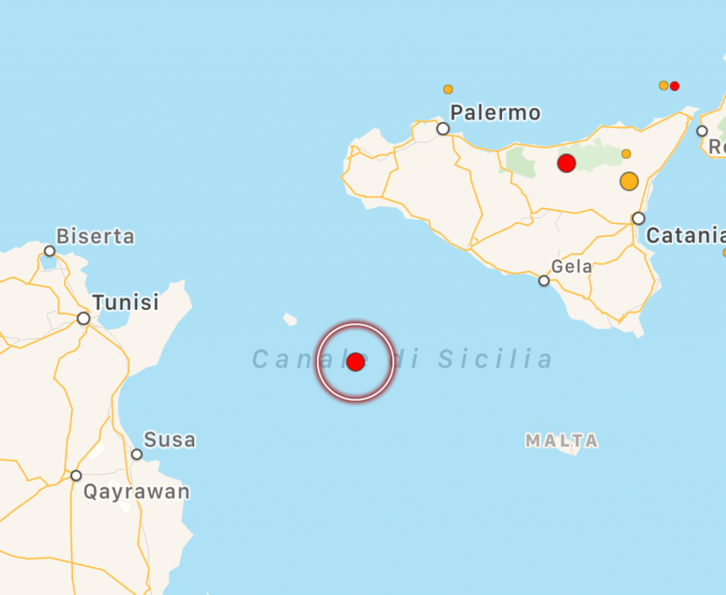 Una scossa di terremoto di magnitudo ML 3.4 si è verificata nel Canale di Sicilia meridionale, in mare, tra le isole di Pantelleria e Malta, alle 11:30:07 ad una profondità di 82 km. L’evento è stato localizzato dalla Sala Sismica INGV-Roma.