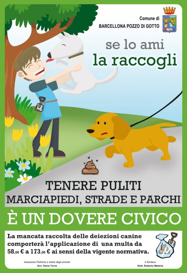 “Se lo ami la raccogli” – spiega l’assessore l’Assessore alle politiche a tutela degli animali, Ilenia Torre- è lo slogan utilizzato sui manifesti che saranno diffusi in tutta con lo scopo di diffondere una cultura del rispetto dei luoghi pubblici e del senso civico nei padroni di cani, invitandoli alla pulizia delle deiezioni del proprio amico a quattro zampe.