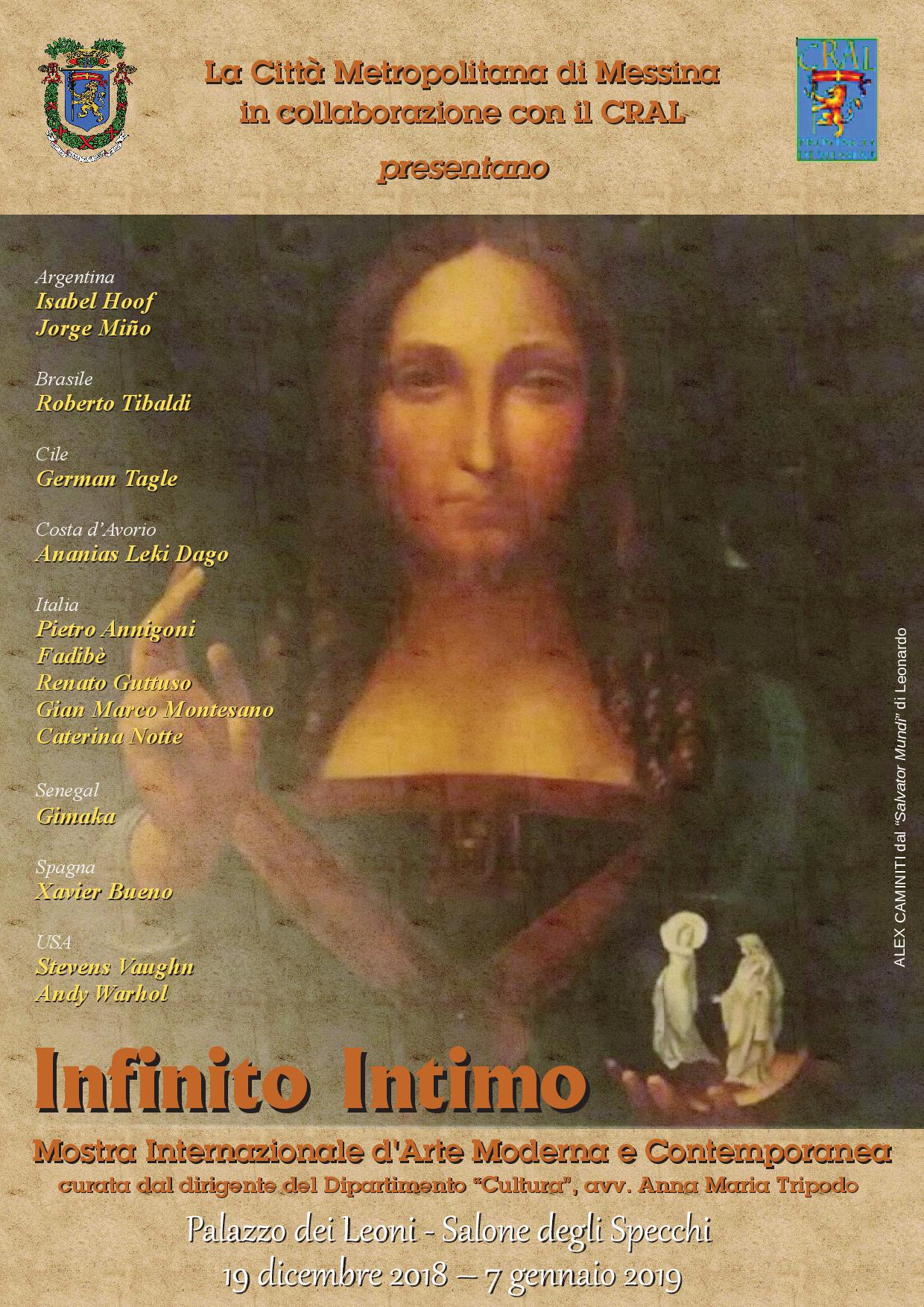 Il Sindaco metropolitano Dott. Cateno De Luca inaugurerà mercoledì 19 dicembre p.v. alle ore 12.00 a Palazzo dei Leoni la mostra internazionale di arte moderna e contemporanea “Infinito Intimo” promossa dalla Città Metropolitana di Messina in collaborazione con il CRAL dell’Ente e curata dal dirigente del dipartimento “Cultura”, Avv. Anna Maria Tripodo.