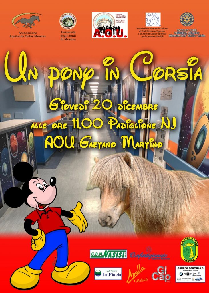 Giovedì 20 dicembre dalle ore 11,00, presso il Padiglione NI dell’Azienda Ospedaliera Universitaria “G. Martino” di Messina, si svolgerà “Un Pony in Corsia”. Nel corso dell’iniziativa, organizzata per la prima volta a Messina, due pony saranno portati nei reparti di Pediatria, Chirurgia Pediatrica, Pediatria d’urgenza, Neuropsichiatria Infantile, con il coinvolgimento di tutte le Unità Operative e tutte le Articolazioni.