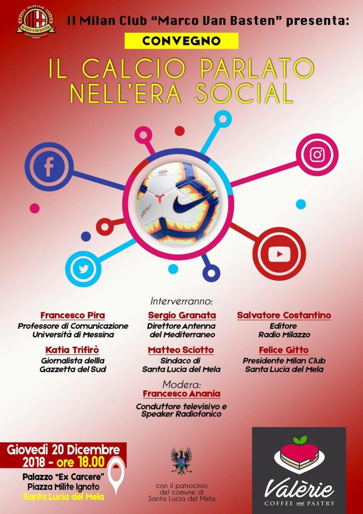 Giovedì 20 dicembre 2018, alle ore 18.00, si svolgerà il convegno “Il calcio parlato nell’era social” presso il Palazzo “Ex Carcere” in Piazza Milite Ignoto nel suggestivo borgo di Santa Lucia del Mela.