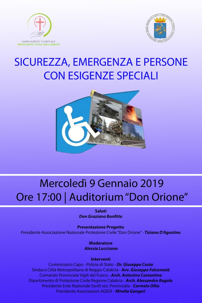 Si svolgerà a Reggio Calabria presso l’Auditorium Don Orione mercoledì 9 gennaio, il Convegno dal titolo “sicurezza, emergenza e persone con esigenze speciali” organizzato dall’Associazione Nazionale di Protezione Civile Don Orione. Gli argomenti al centro del dibattito saranno il crescente coinvolgimento delle persone con disabilità nella sicurezza e nella prevenzione del rischio e l’intervento in caso di emergenza.