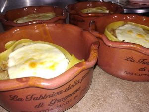 Preparazione: abbiamo fatto cuocere in acqua bollente salata quattro caccavelle per il tempo di cottura indicato sulla confezione (16 minuti), le abbiamo scolate e fatte raffreddare. A parte abbiamo unito 300 grammi circa di carne macinata mista, formaggio grattugiato, prezzemolo, pepe nero, sale e aromi a scelta. Abbiamo fatto saltare il tutto in padella con un filo d’olio e poco burro fino a completa cottura della carne. Abbiamo fatto raffreddare il composto, gli abbiamo aggiunto qualche cucchiaio di besciamella per ammorbidire il tutto e abbiamo riempito le caccavelle. Abbiamo inserito le caccavelle nelle scodelle in terracotta che avevamo precedentemente unto con del burro, abbiamo affettato una mozzarella di bufala e abbiamo adagiato le singole fette sulle caccavelle. Infine abbiamo infornato a 200 gradi fino al completo scioglimento della mozzarella, aggiungendo un filo d’olio su ogni scodella quasi a fine cottura. Servire ancora calde.