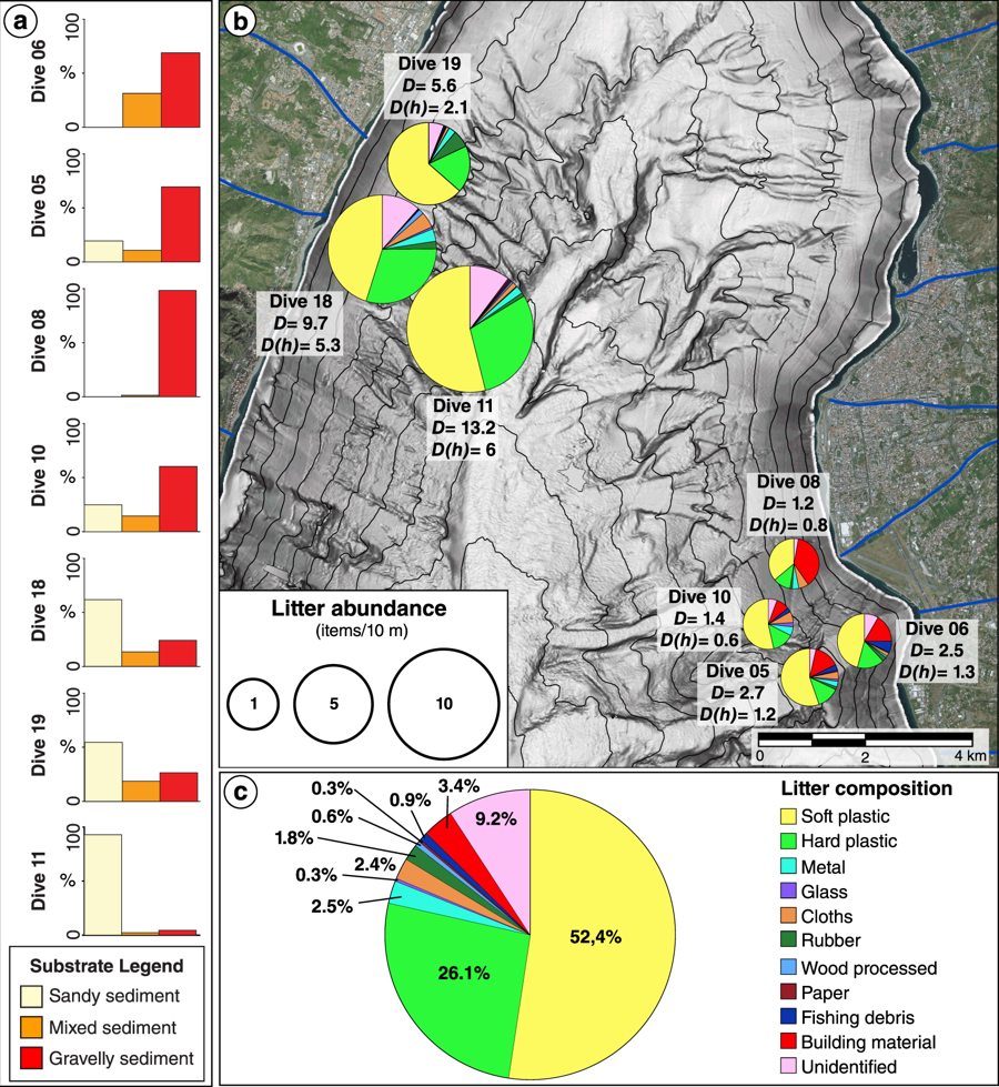 Dalle analisi delle video osservazioni di veicoli controllati a distanza, dei dati dei sonar a scansione laterale e dei dati morfo-batimetrici, i ricercatori sono stati in grado di descrivere una sorprendente quantità di rifiuti bentici in queste aree. Sono stati ritrovati quasi 4.000 oggetti su una distanza lineare di 6.420 metri in quattro punti dello Stretto, due di fronte a Reggio Calabria e due sul versante siciliano. La distribuzione dei rifiuti è eterogenea, con concentrazioni più alte all’interno dei canali siciliani rispetto a quelli calabresi. Un generale aumento nell’abbondanza dei rifiuti è osservato all’interno di ogni singolo canale con maggiore profondità. Per quanto riguarda la composizione dei rifiuti, la plastica morbida, rappresentata essenzialmente da sacchetti e confezioni di plastica, è la categoria di gran lunga più diffusa, rappresentando il 52,4% di tutti i rifiuti, seguita da plastica rigida (26,1%), materiali edili (3%), legno (2,5%), vestiti (2,4%). La tipologia degli oggetti osservati suggerisce che la maggior parte dei detriti antropogenici nello Stretto di Messina si origini da fonti terrestri.