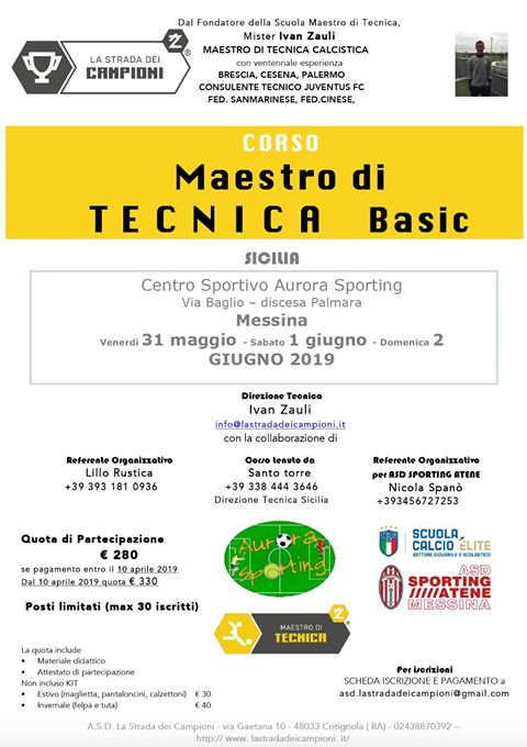 Prenderà il via anche a Messina, dal 31 maggio al 2 giugno, il Corso di Maestro di Tecnica Basic di calcio giovanile. La tre giorni, organizzata dal referente de “La Strada dei Campioni” a Messina, Lillo Rustica e dalla SD Sporting Atene del presidente Nicola Spanò, si svolgerà presso il centro sportivo Aurora Sporting in via Baglio. A tenere il corso sarà il responsabile tecnico Santo Torre. Il corso prevede un massimo di 30 iscritti e le iscrizioni sono già aperte. Di seguito la locandina con tutte le info utili: