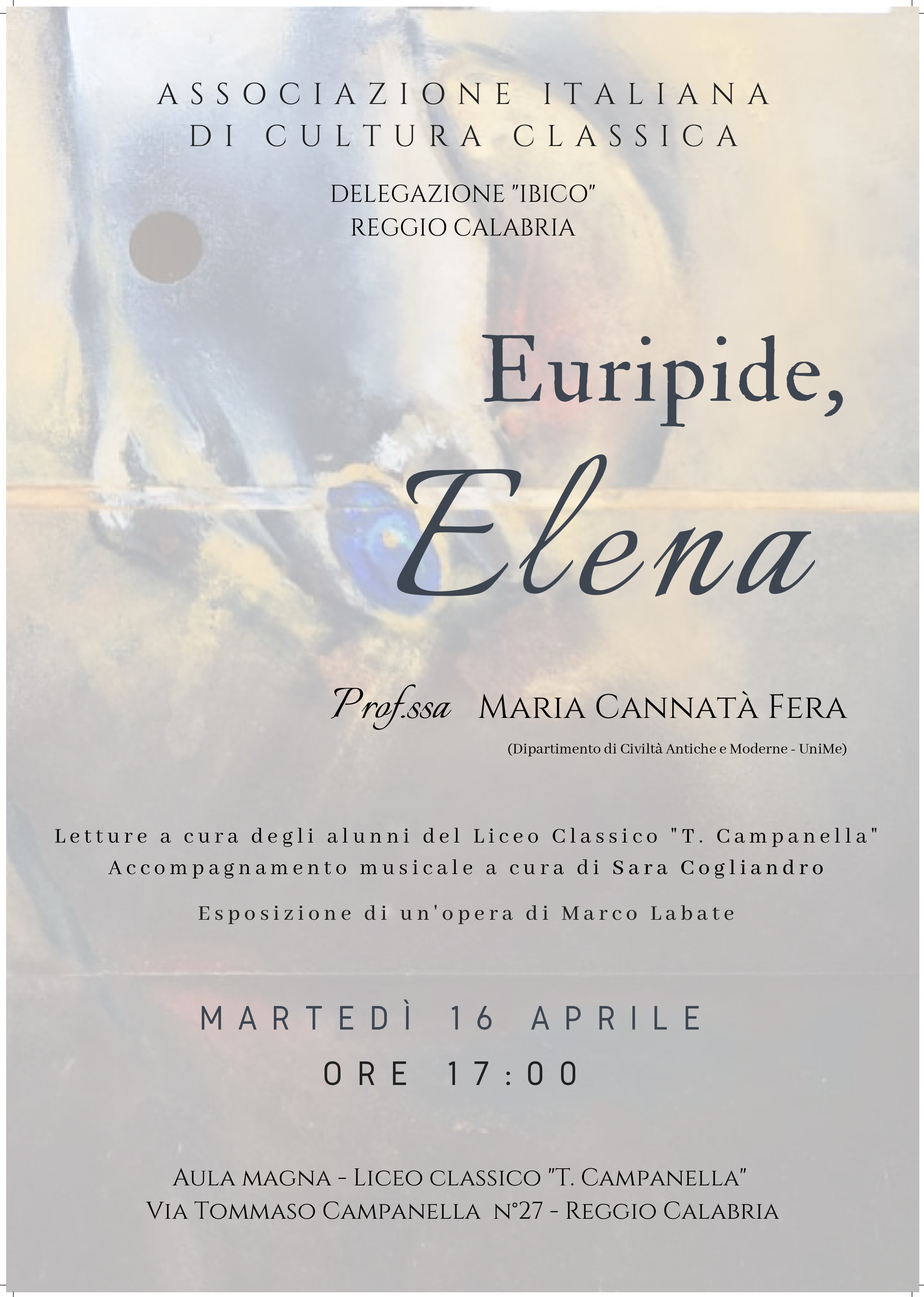 La relazione avrà come oggetto l’Elena di Euripide: la prof.ssa Cannatà illustrerà nel dettaglio gli aspetti notevoli dell’opera da un punto di vista storico, letterario e filologico, soffermandosi in particolare sull’interpretazione e sul commento di alcuni passi scelti della tragedia, la cui lettura verrà curata da un gruppo di alunni del Campanella, accompagnati dalle musiche eseguite da Sara Cogliandro, giovane e promettente violinista, anche lei studentessa del prestigioso Liceo reggino. L’incontro si propone di introdurre alla messa in scena della tragedia euripidea, prevista in occasione dell’ormai prossimo 55° Festival del Teatro Greco di Siracusa.