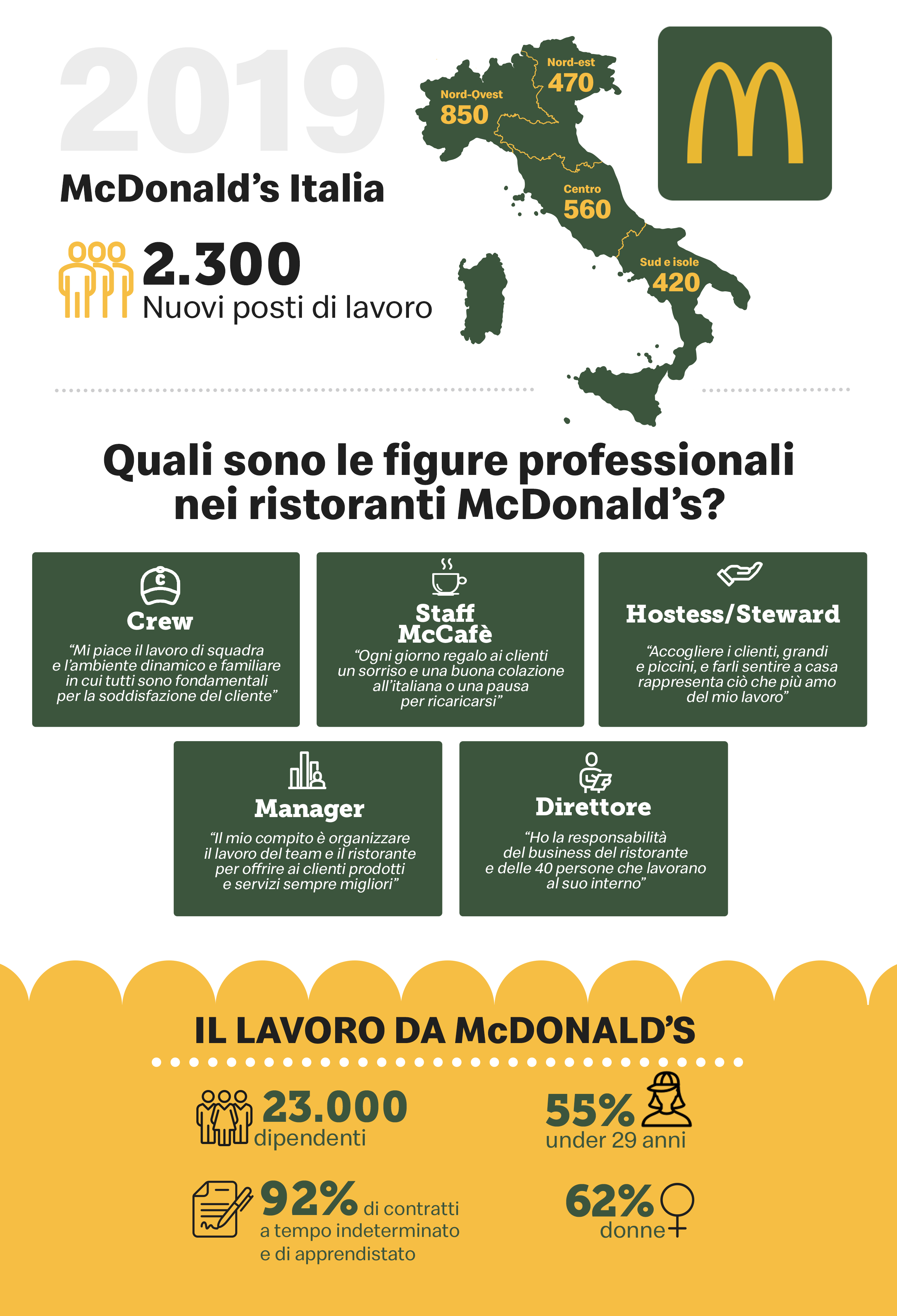 (62%), che costituiscono anche il 50% degli store manager. L’età media dei dipendenti è 31,5 anni, 30 per i crew, 35 per i manager e 39 per gli store manager. Il 92% dei dipendenti che lavora da McDonald’s è assunto con contratti di apprendistato o a tempo indeterminato.