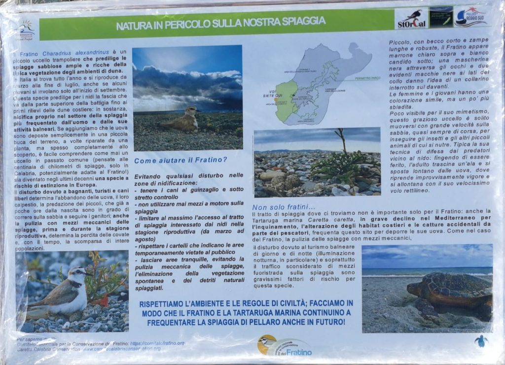 “Siamo convinti, che il degrado ambientale generi un progressivo allontanamento degli individui dalla vita pubblica ed un generale impoverimento dello spazio collettivo ed è per questo che chiediamo che la comunità partecipi più attivamente alla salvaguardia e alla tutela dello spazio pubblico, ponendosi come sentinelle a contrasto di gesti che non fanno altro che alimentare il degrado ambientale e lo spopolamento dei luoghi. Queste pratiche sociali che caratterizzano gli spazi di uso collettivo, le azioni formali e informali che includono dimensioni come la creatività, la progettualità, la partecipazione e la condivisione possono rappresentare un valido aiuto anche per la governance pubblica affinchè i cittadini possano riappropriarsi dei luoghi e farne parte anche e soprattutto in termini di responsabilità civica. Su questa spiaggia sulla quale ricade anche una piccolissima area classificata come “Area Protetta” nel piano spiagge comunale, sopravvivono e tentano di riprodursi due specie animali di grande rilievo naturalistico, tra le più minacciate in Italia: Il Fratino (Charadrius Alexandrinus), piccolo uccello che depone le uova direttamente sulla sabbia e la Tartaruga Caretta caretta. I loro tentativi di nidificazione sono spesso vanificati dai comportamenti impropri o illeciti di molti soggetti, in prevalenza pescatori, che percorrono l’arenile con veicoli a motore e vi abbandonano rifiuti di ogni genere. Punta Pellaro è anche un importante punto di transito di uccelli migratori come rapaci e cicogne che la sorvolano durante i due viaggi migratori da e verso l’Africa. Inoltre è un luogo particolarmente idoneo all’osservazione di uccelli marini, come Berta Maggiore e Berta Minore, Beccapesci, Sterne, ect”.