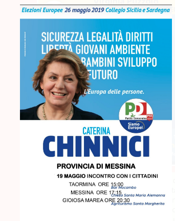 L’appuntamento in città fa parte del tour di domenica 19 per la provincia messinese, che vedrà Caterina Chinnici partecipare ad un incontro a Taormina alle 15 al bar Mocambo, ed a Gioiosa Marea, all’agriturismo Santa Margherita, alle 20. Virginia Puzzolo interverrà invece a Letojanni alle 11, e a Nizza alle 16, presso il circolo del Partito democratico.