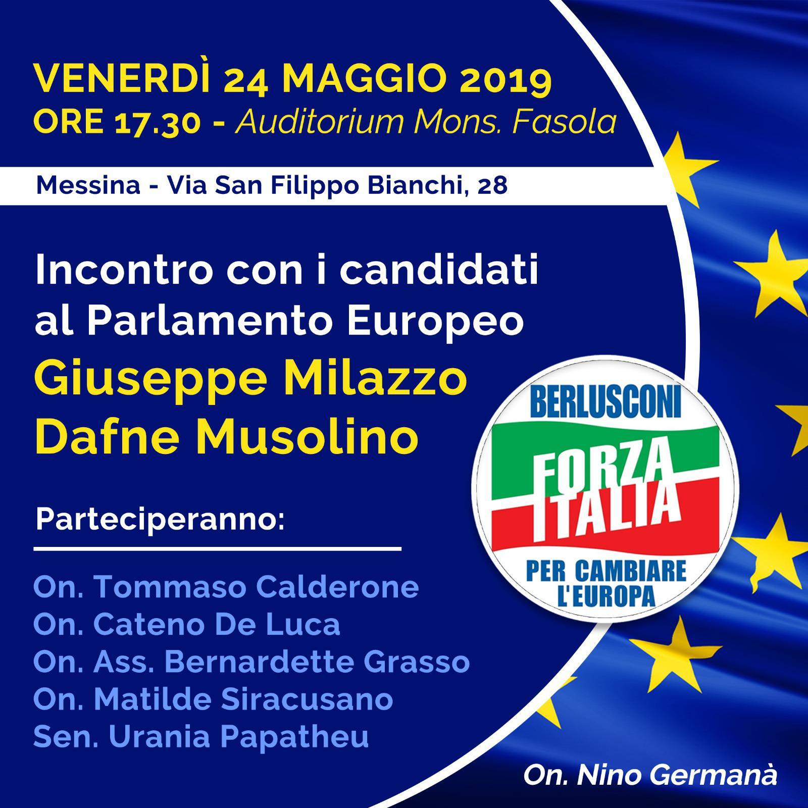 Forza Italia chiuderà la campagna elettorale per le Europee 2019 a Messina con un incontro con i candidati al Parlamento Europeo Giuseppe Milazzo e Dafne Musolino, organizzato dall’on. Nino Germanà alla presenza di tutta la deputazione regionale e nazionale.