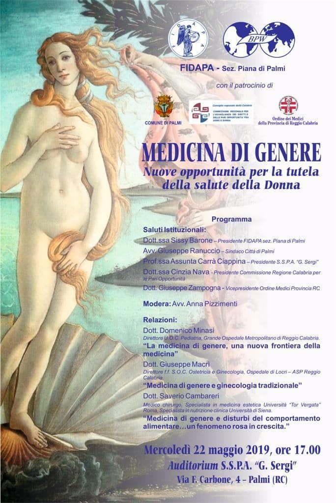 Si terrà oggi pomeriggio a Palmi, in provincia di Reggio Calabria, il convegno “Medicina di genere – Nuove opportunità per la tutela della salute della Donna“. Organizzato da FIDAPA – Sez. Piana di Palmi con il patrocinio del Comune di Palmi, della Commissione Pari Opportunità della Calabria e dell’Ordine dei Medici della Provincia di Reggio Calabria, il convegno si svolgerà alle 17:00 di oggi, mercoledì 22 maggio, presso l’Auditorium S.S.P.A. “G. Sergi”.