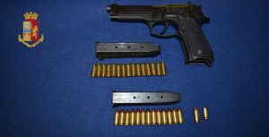 Il rapinatore veniva immediatamente bloccato, disarmato e sottoposto a perquisizione personale che consentiva di rinvenire nella tasca sinistra posteriore dei pantaloni, un caricatore bifilare per pistola semiautomatica rifornito con quindici cartucce, oltre ad una singola cartuccia sfusa. Il soggetto veniva quindi tratto in arresto e condotto in Questura per gli adempimenti di rito a suo carico.